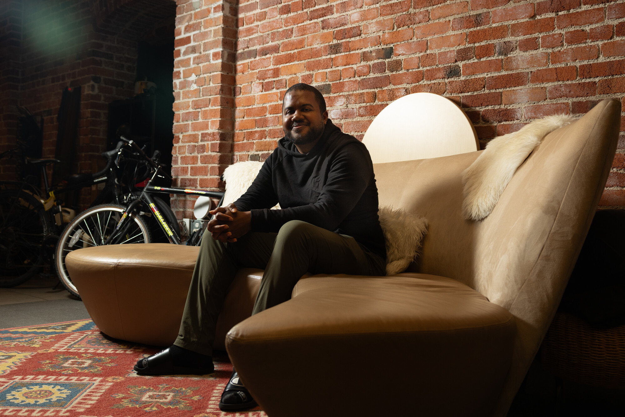 James Stallworth, co-founder of Brownstone, a pod-based co-living startup, poses in the common area on April 10, 2026, in San Francisco. (Gustavo Hernandez/KQED)