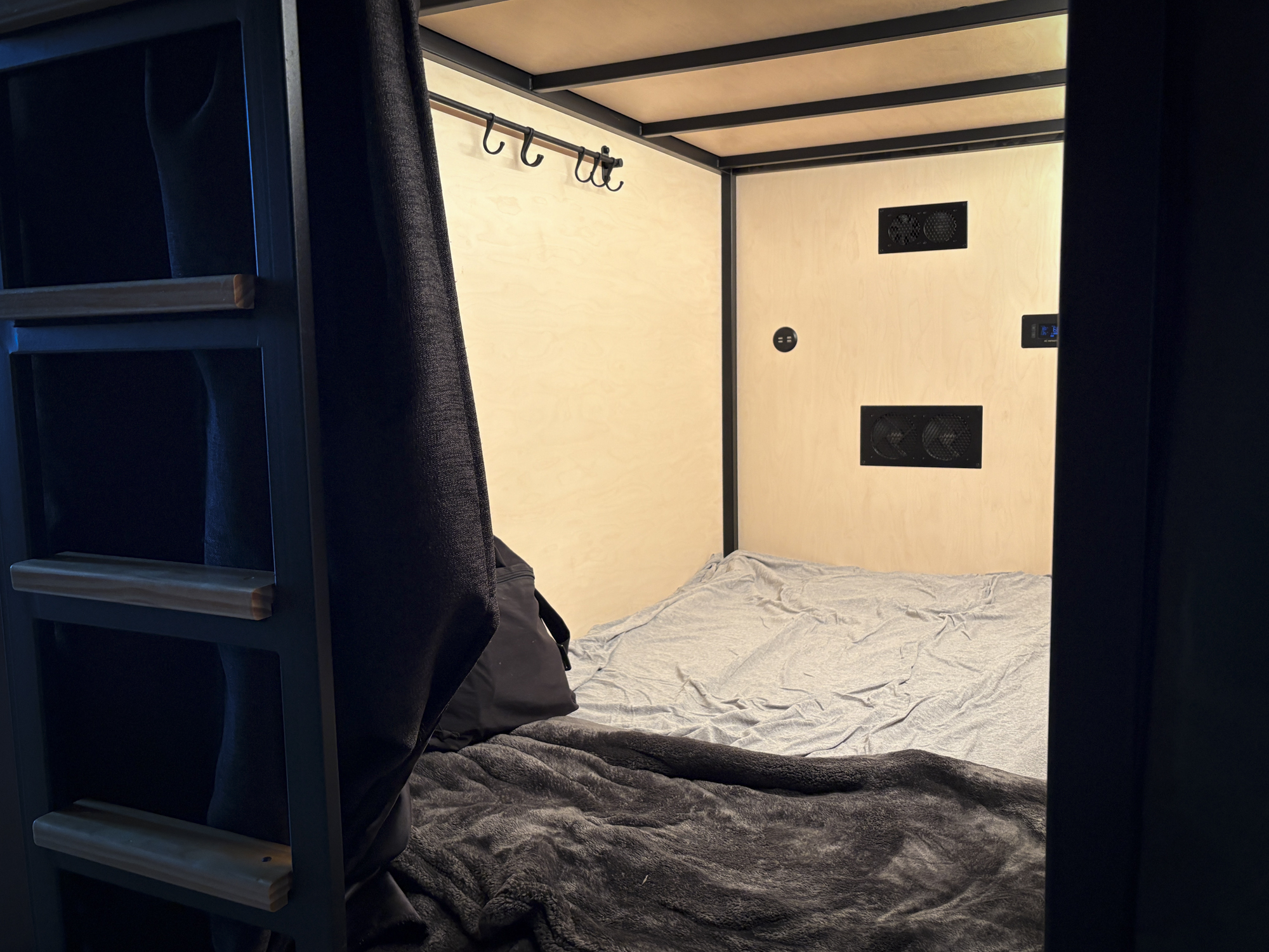 The inside of a sleeping pod at Brownstone’s co-living space at 12 Mint Plaza on March 16, 2026, in San Francisco. (Sydney Johnson/KQED)