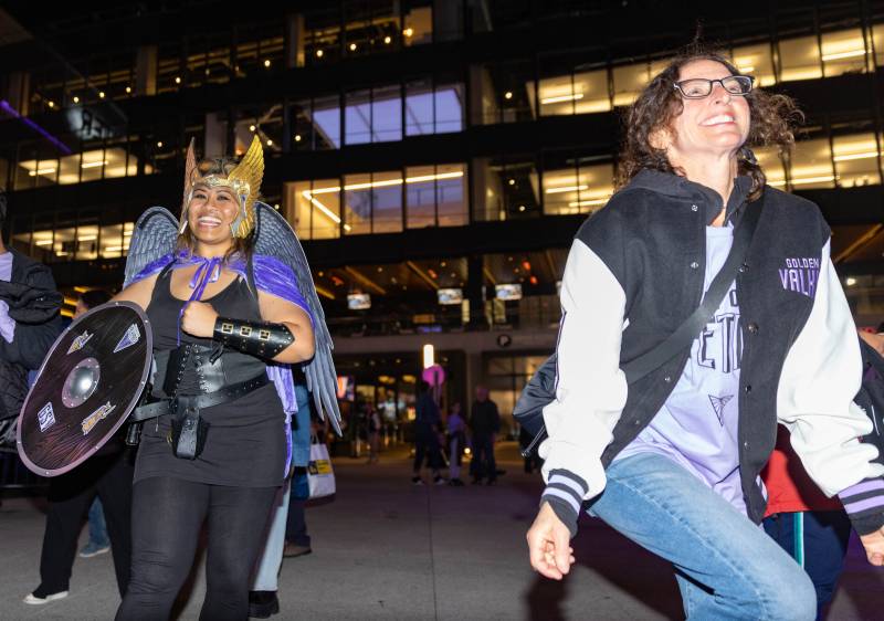 Jhunehl Fortaleza, left, dressed as a Valkyrie, dances outside of Chase Center, following the WNBA game between the Golden State Valkyries and the Los Angeles Sparks on May 16, 2025. It’s the Valkyries’ second-ever season as a professional women’s basketball team. Here’s how to attend a game in San Francisco. (Gina Castro/KQED)