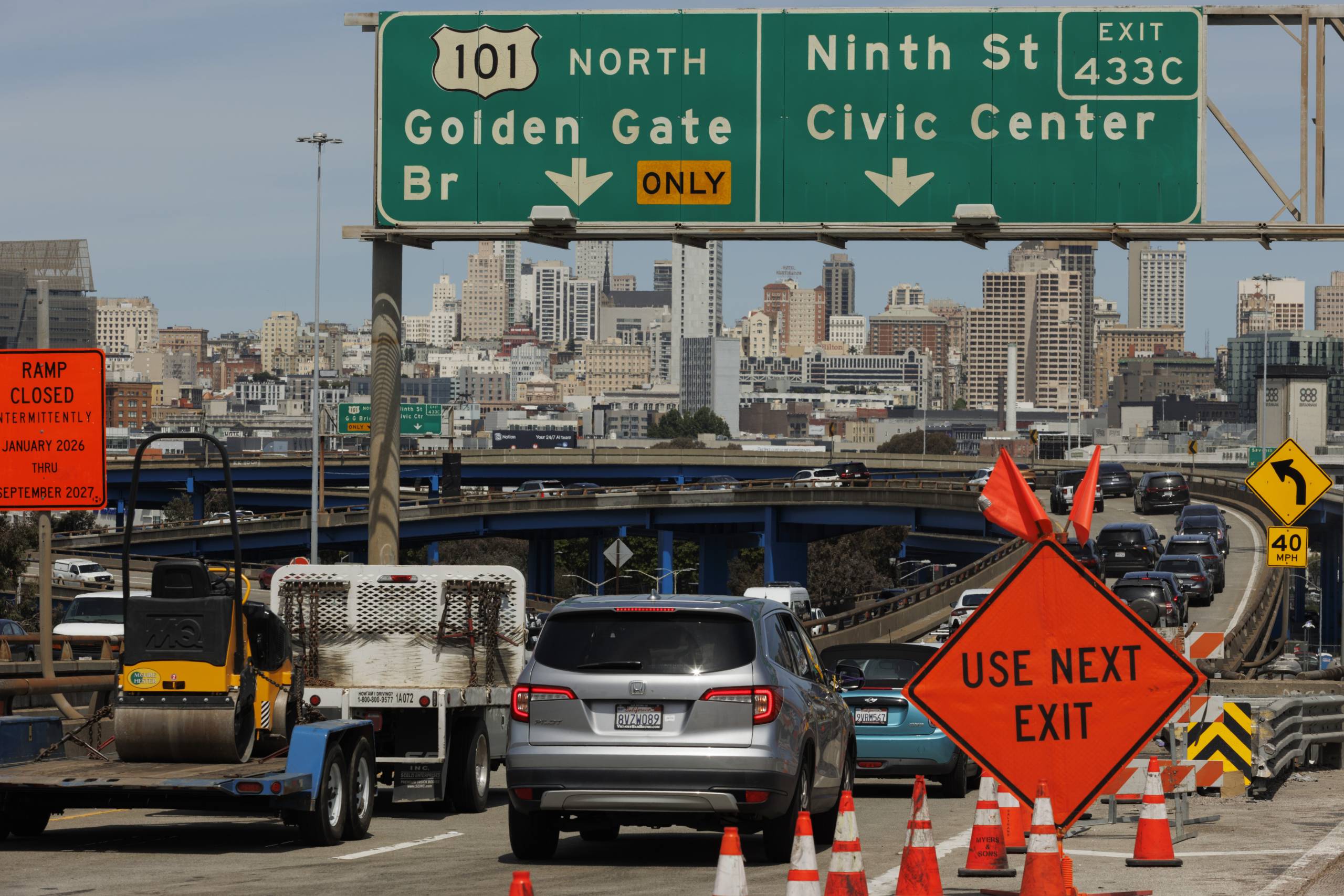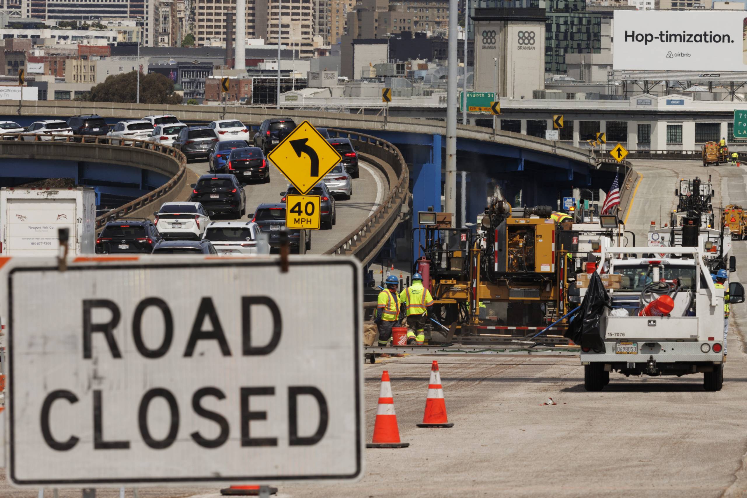 Traffic is rerouted from eastbound Interstate 80 to U.S. Highway 101 as Caltrans performs construction in San Francisco on April 18, 2026. Crews are repairing viaducts, prompting the closure of a stretch of I-80 through early Monday morning.