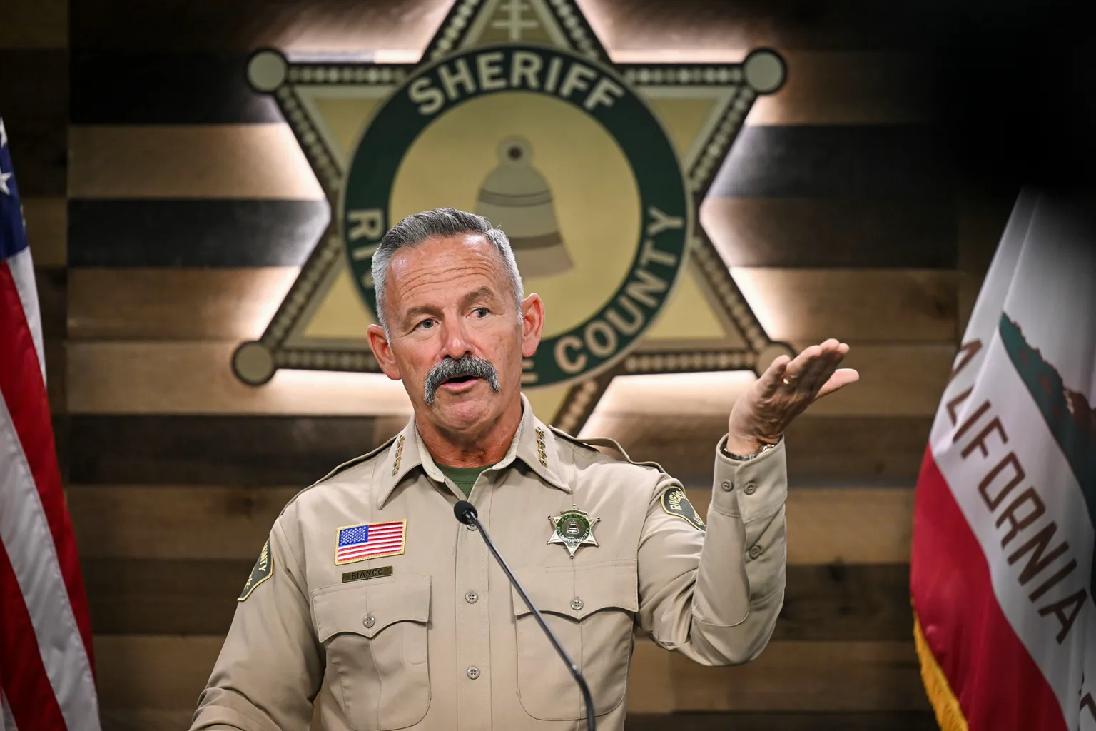 Riverside County Sheriff Chad Bianco speaks during a news conference about his department’s investigation into alleged election fraud in the county on March 20, 2026. (Anjali Sharif-Paul/The Sun via Getty Images)