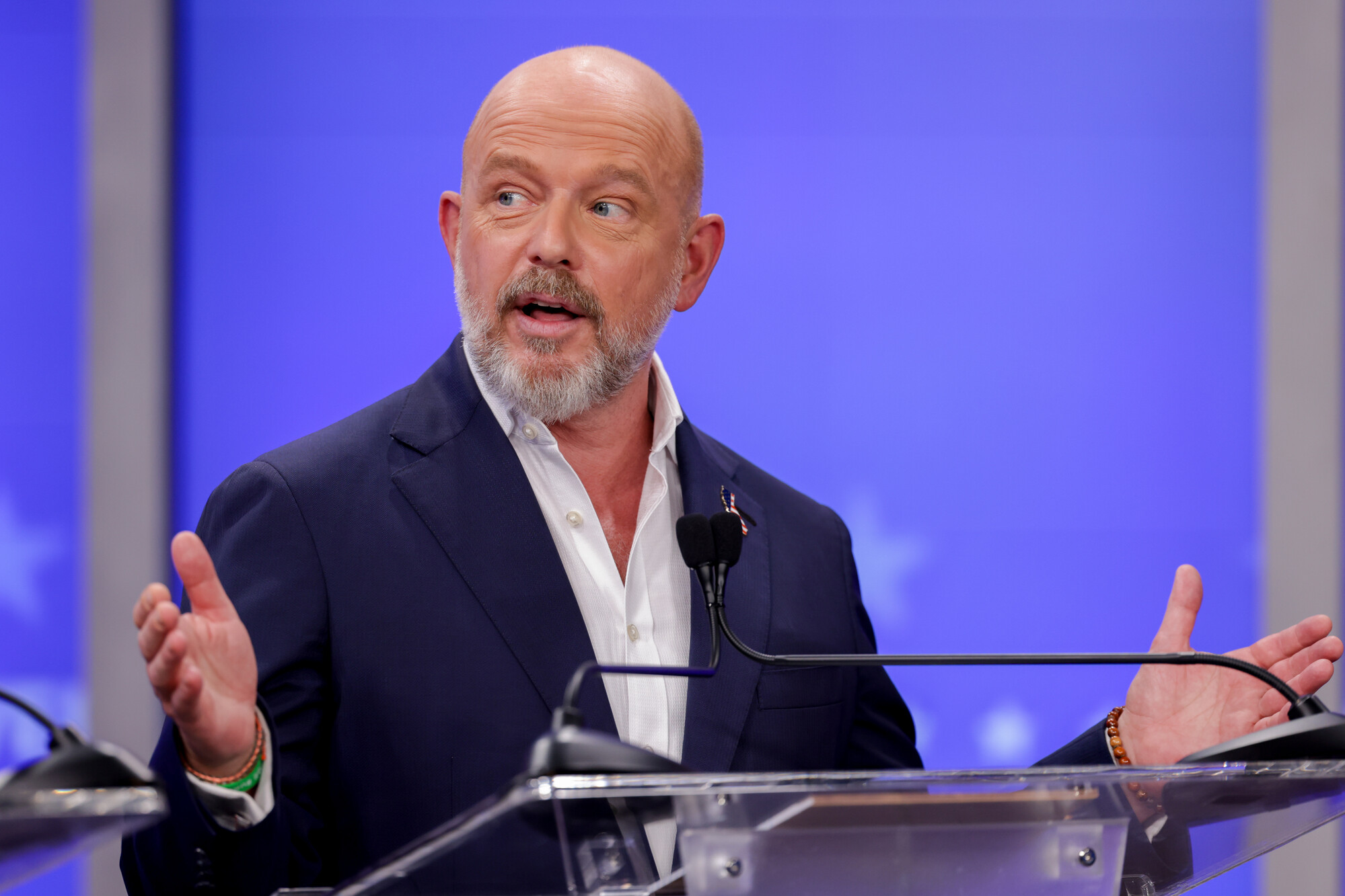 Steve Hilton, a Republican candidate for California governor, leaned into President Donald Trump’s endorsement — calling it “a deep honor” — during a televised debate at KRON Studios in San Francisco on April 22, 2026. (Jason Henry/Nexstar/Bloomberg)
