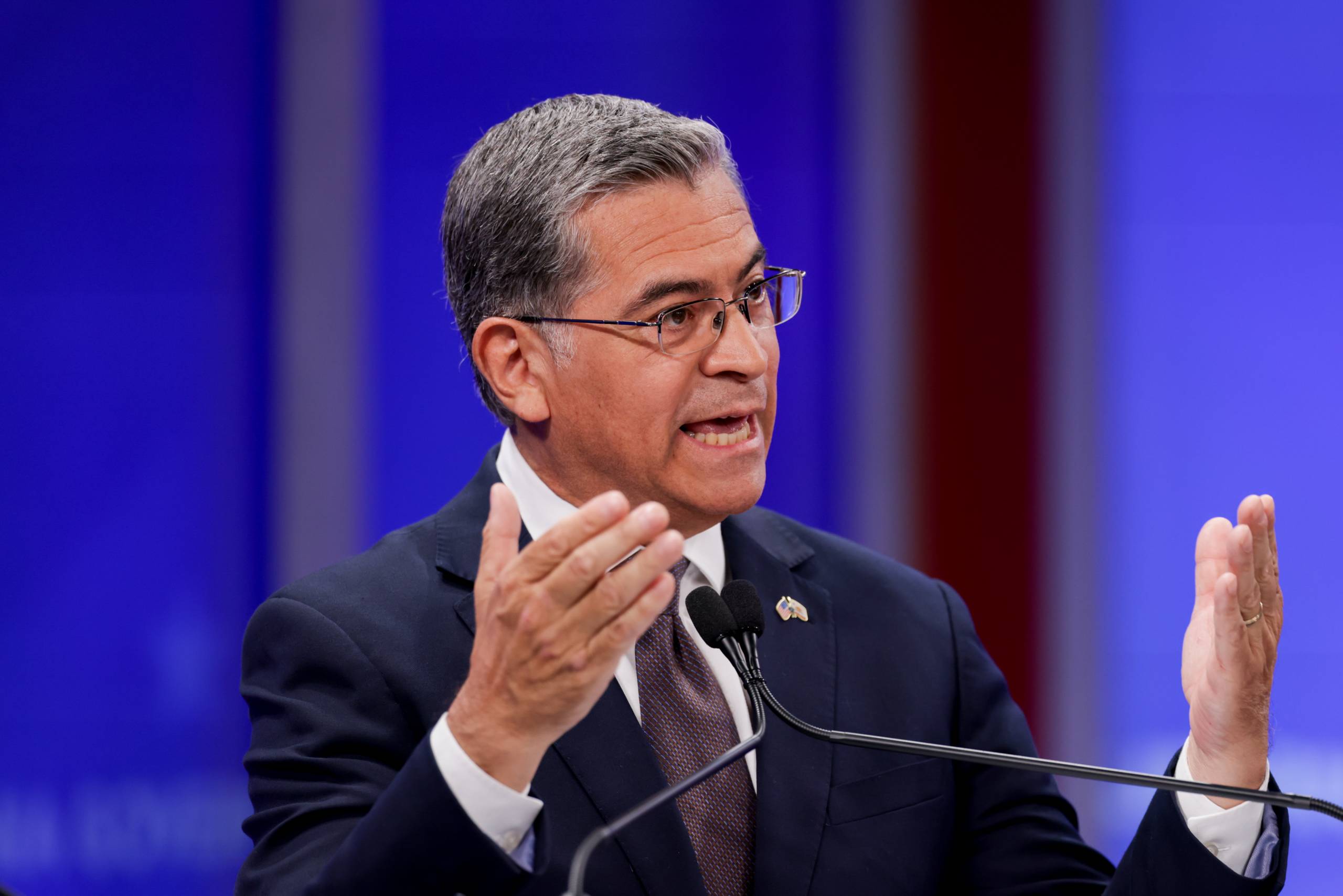 Xavier Becerra, a Democratic candidate for California governor, called for experienced leadership as he spoke during a televised debate at KRON Studios in San Francisco on April 22, 2026. (Jason Henry/Nexstar/Bloomberg)