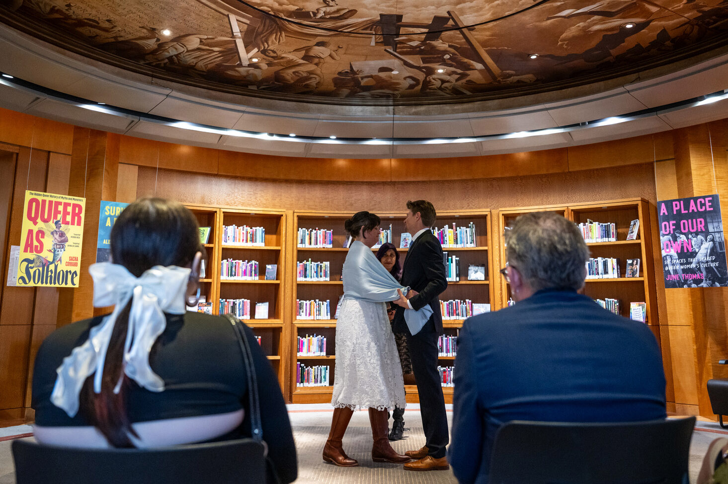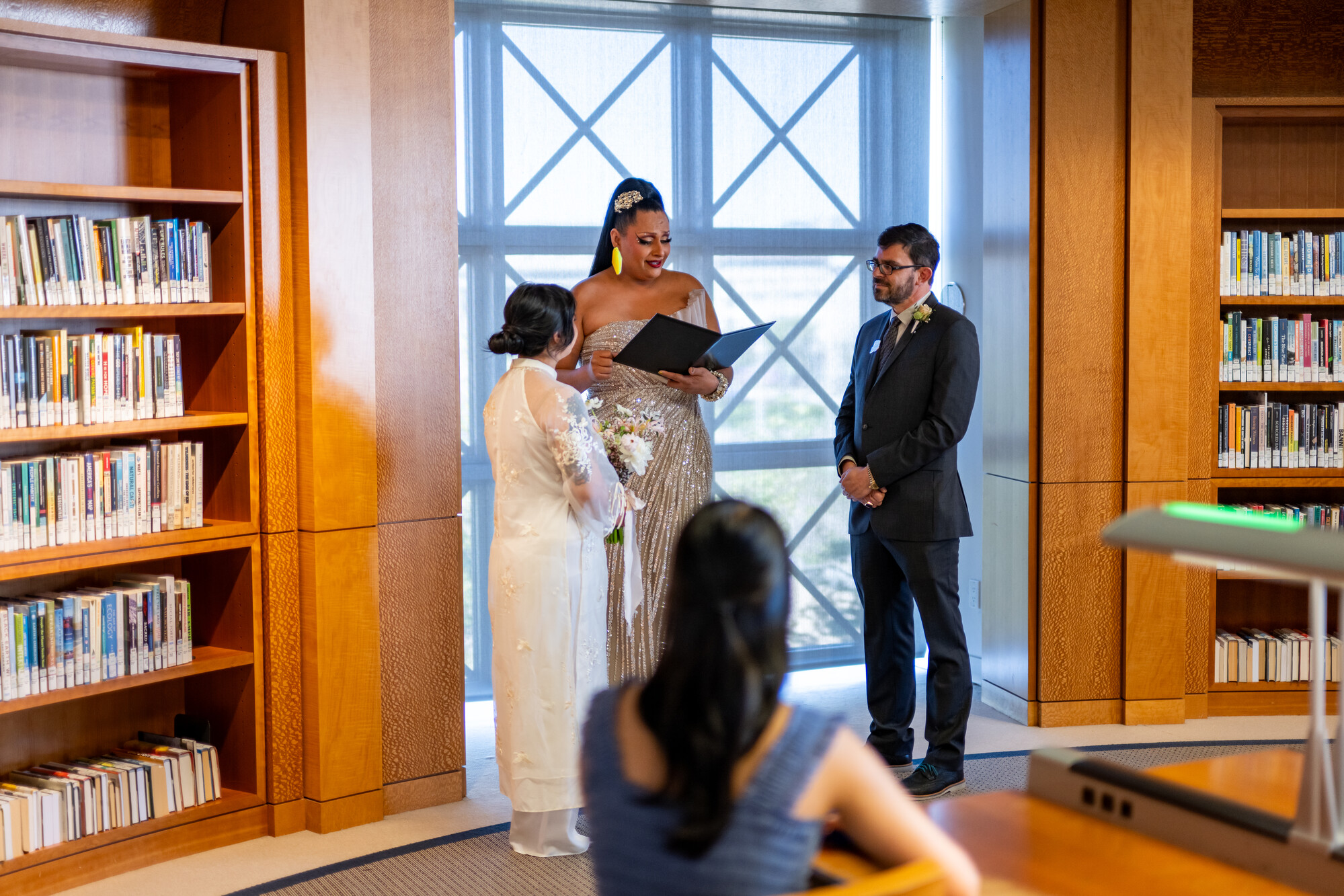 Small, intimate ceremonies were held throughout the main branch before the library officially opened to the public, allowing couples and their families to gather and pose for photos among the bookshelves.