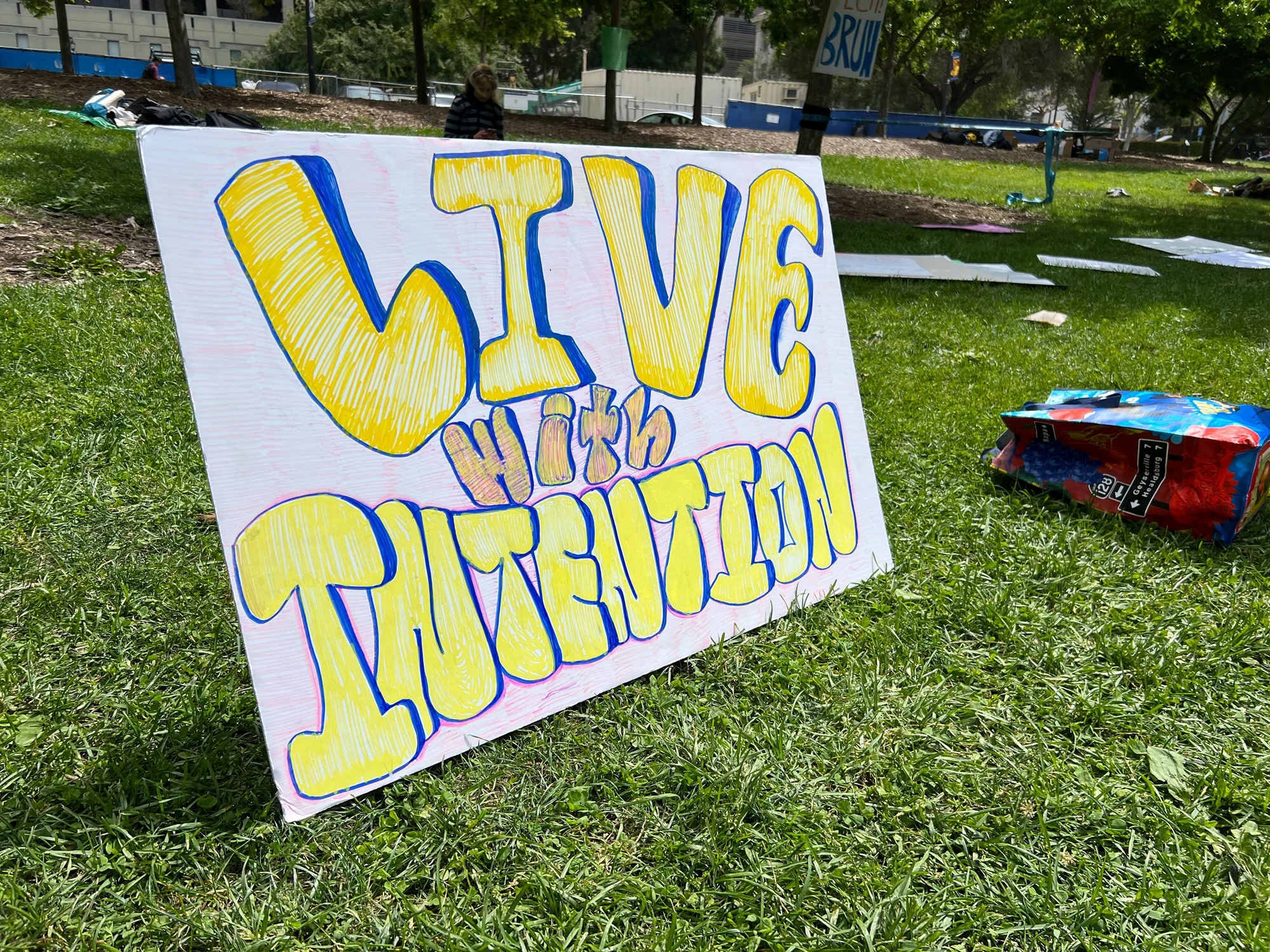 A handmade sign reads “Live With Intention” at a phone-free event at UC Berkeley on Friday, April 24, 2026. (Eliza Peppel/KQED)