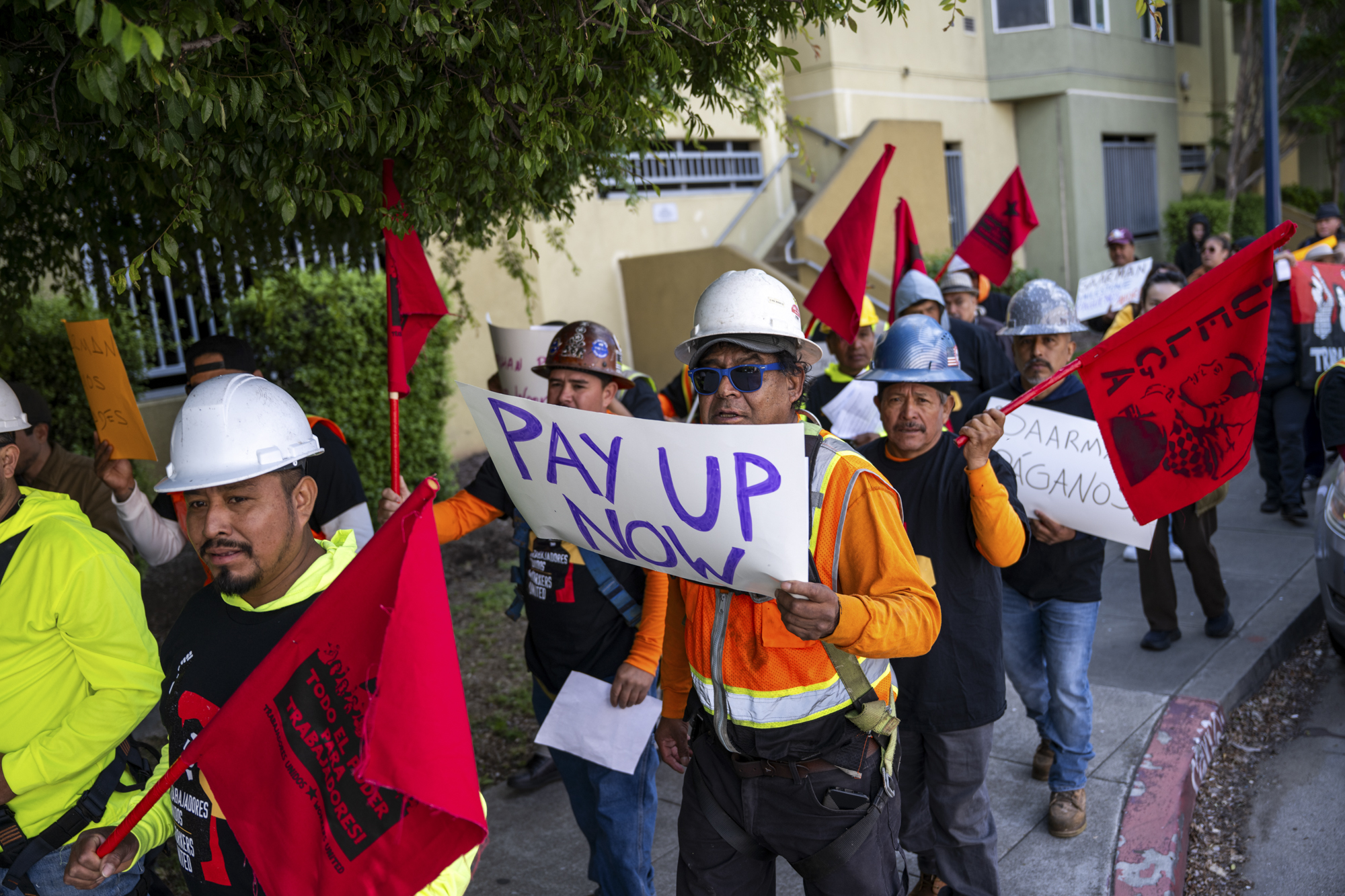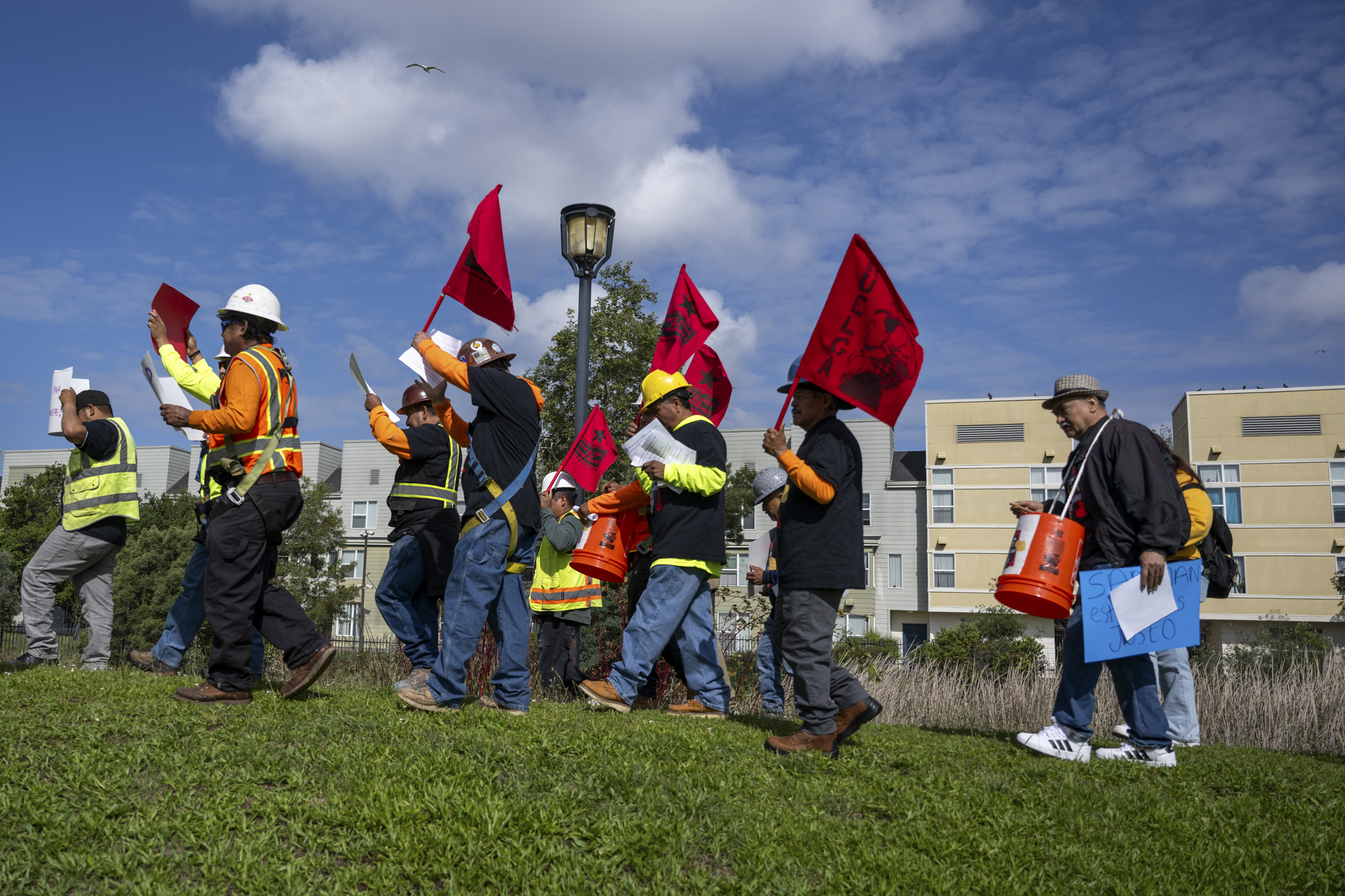 Construction workers and supporters march through Oakland to the Lion Creek Crossings, an affordable housing complex, on April 27, 2026, as part of a demonstration calling for more than $300,000 in unpaid wages from Bay Area contractors Milestone Roofing and Saarman Construction. (Beth LaBerge/KQED)