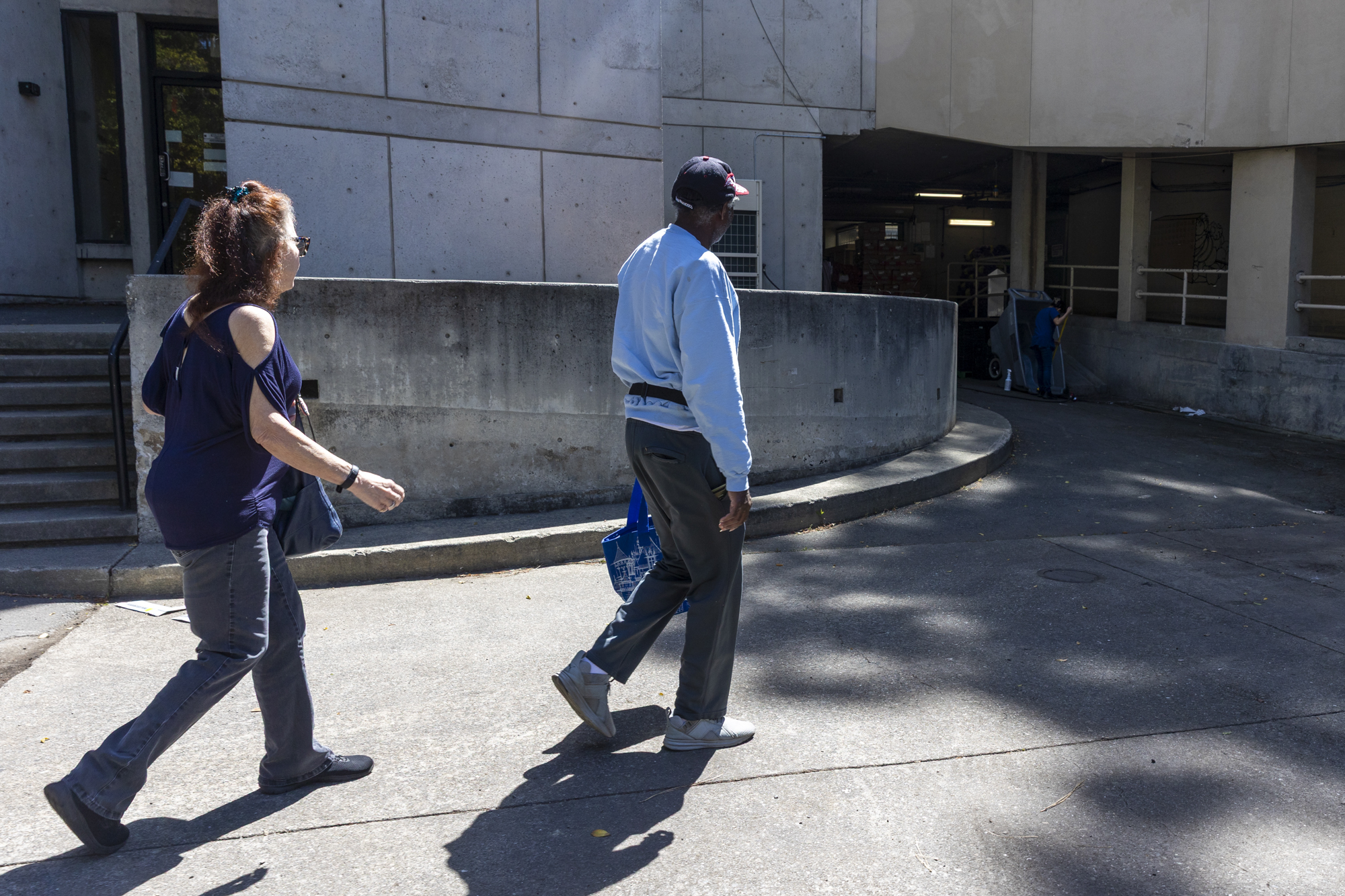Shekinah Samaya-Thomas (left) and her husband Christopher Samaya-Thomas (right) walk into a food distribution center to pick up groceries in Oakland on April 16, 2026. (Tâm Vũ/KQED)