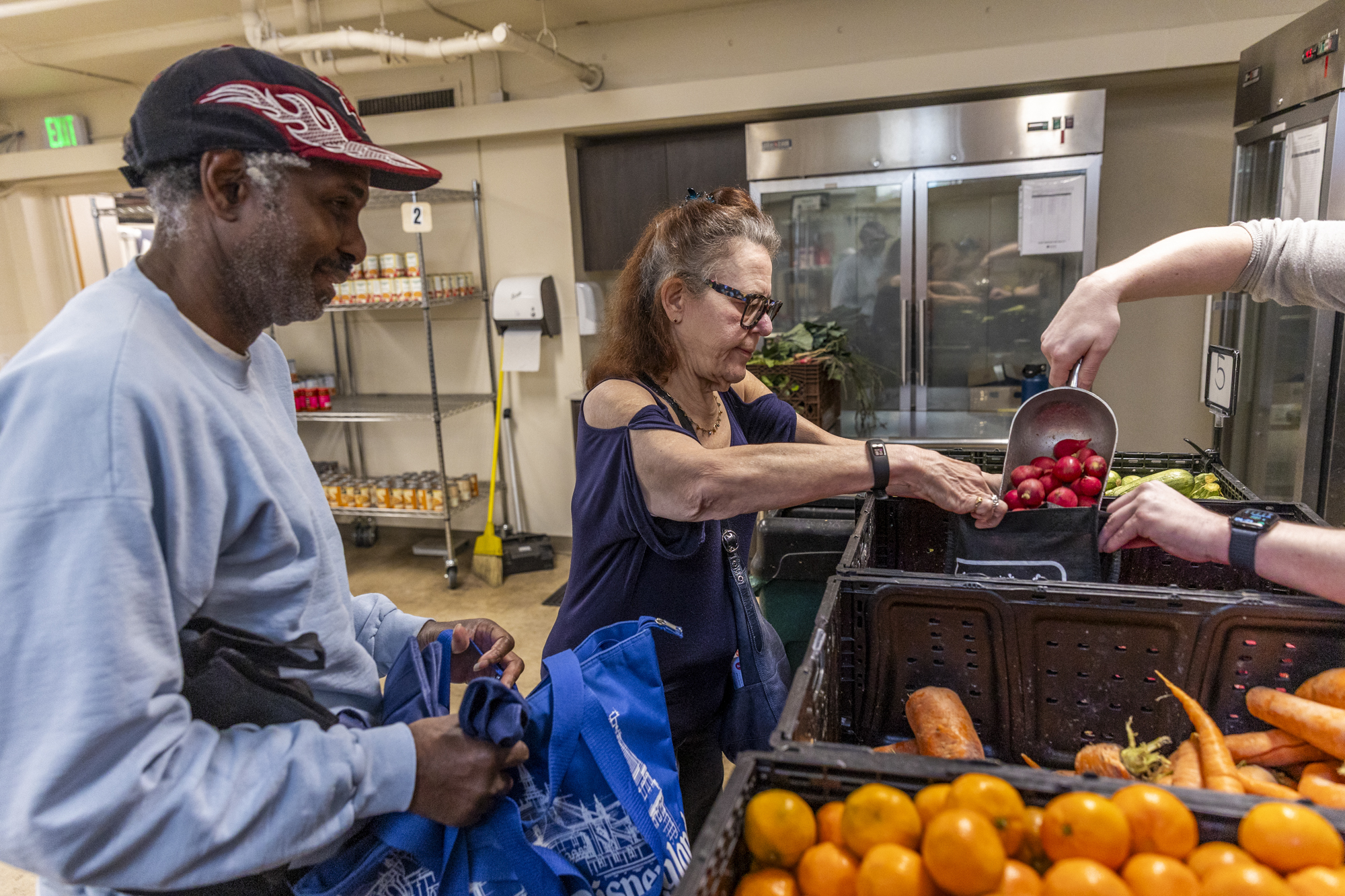 Christopher Samaya-Thomas (left) and his wife Shekinah Samaya-Thomas (right) pick up groceries at a food distribution center in Oakland on April 16, 2026. (Tâm Vũ/KQED)
