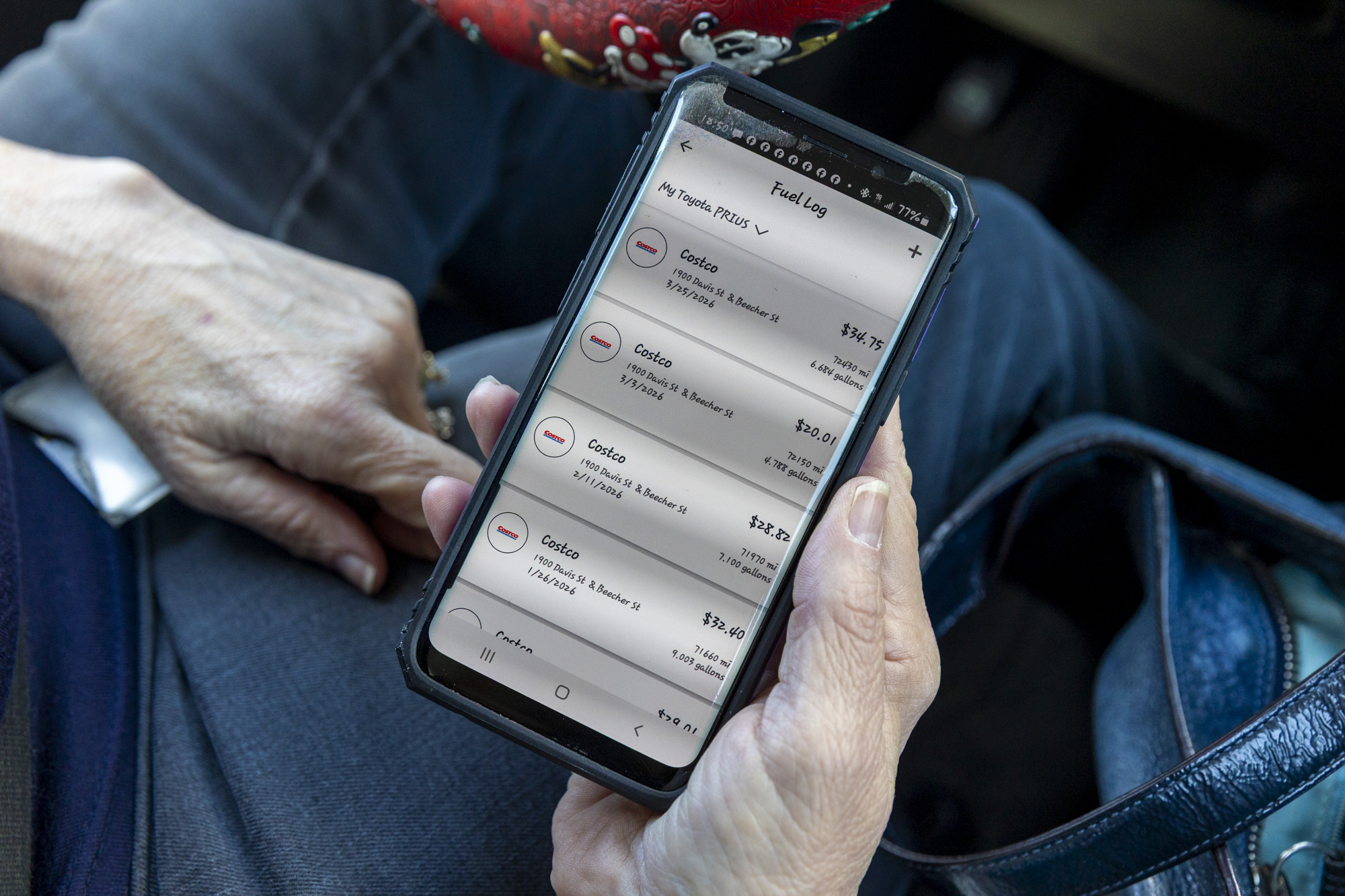 Shekinah Samaya-Thomas shows her gas log on her phone while she waits in line at a Costco gas station in Oakland on April 16, 2026. (Tâm Vũ/KQED)
