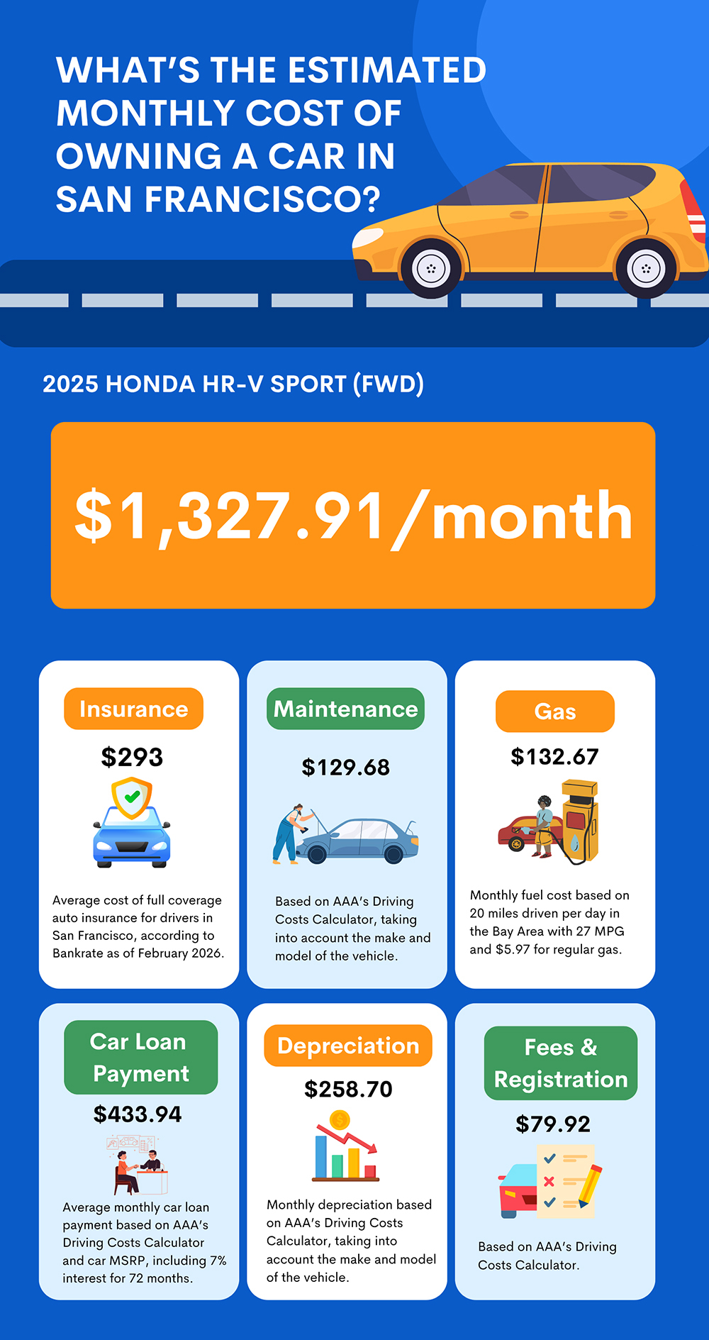 The cost breakdown of owning and driving a new car in San Francisco includes multiple factors, such as gas, maintenance and insurance. (