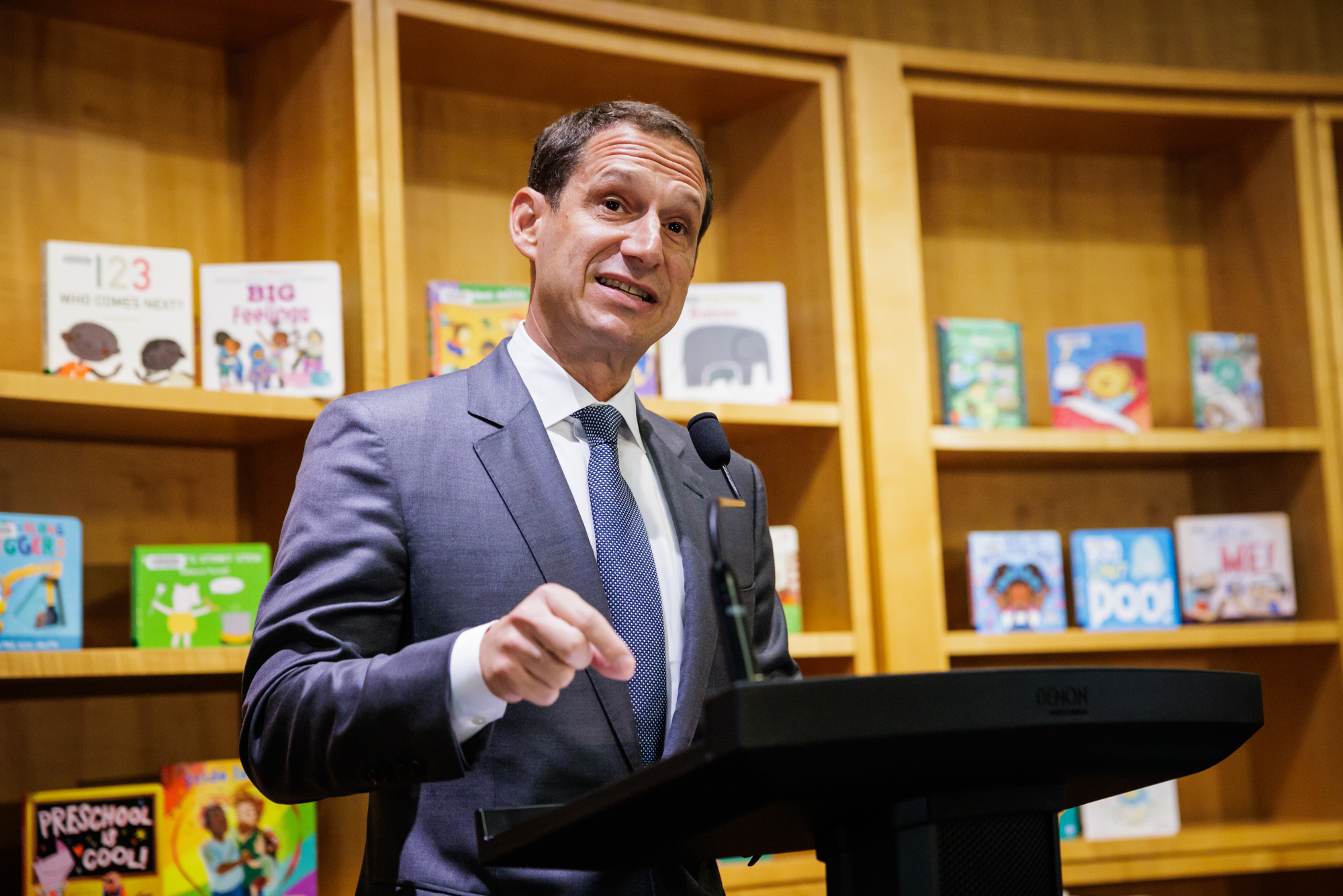 San Francisco Mayor Daniel Lurie speaks at the Main Library in San Francisco at an event celebrating a new partnership between city officials and Dolly Parton’s Imagination Library on Sept. 12, 2025. (Martin do Nascimento/KQED)