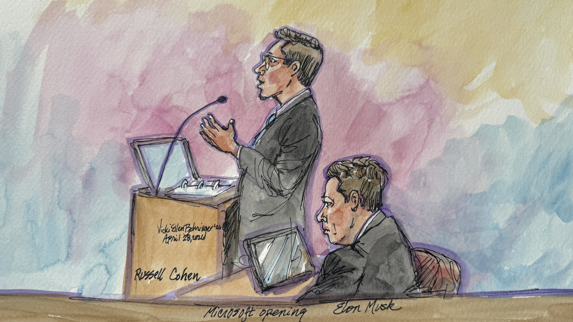 Representing Microsoft, Russell Coan (left) speaks as Elon Musk watches in the trial in which Elon Musk claims that Sam Altman and OpenAI abandoned their founding promise to develop AI for the benefit of humanity, rather than solely for profit, in Oakland on April 28, 2026. (Vicki Behringer for KQED)
