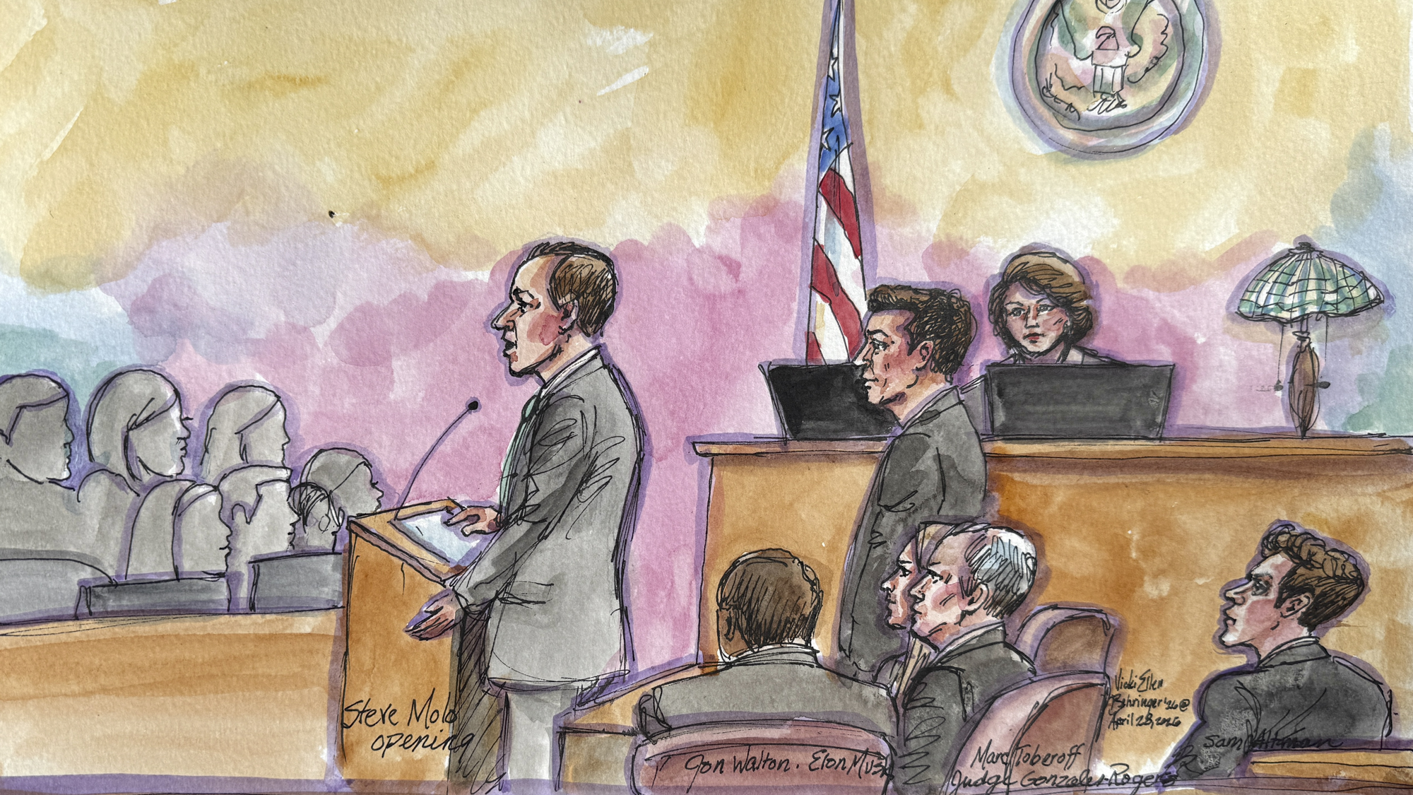 Steve Molo, Elon Musk’s attorney, presents opening statements in the trial in which Elon Musk (center-right) claims that Sam Altman (right) and OpenAI abandoned their founding promise to develop AI for the benefit of humanity, rather than solely for profit, in Oakland on April 28, 2026. (Vicki Behringer for KQED)