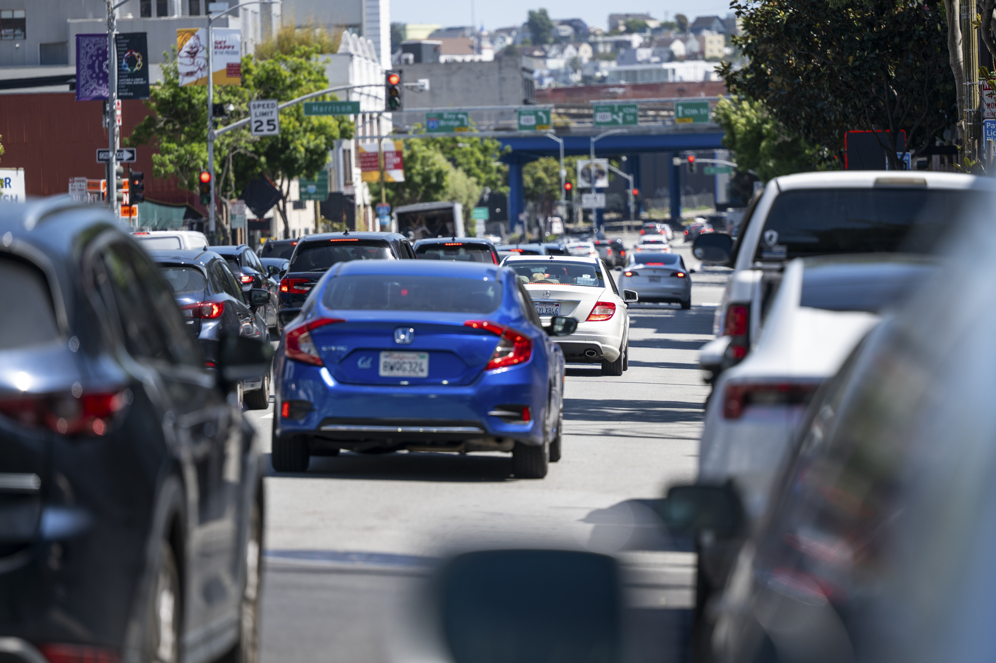 Vehicles drive on 10th Street between Harrison and Folsom streets in San Francisco on April 28, 2026, where a speed camera is part of a city pilot program to reduce speeding and traffic injuries. (Beth LaBerge/KQED)