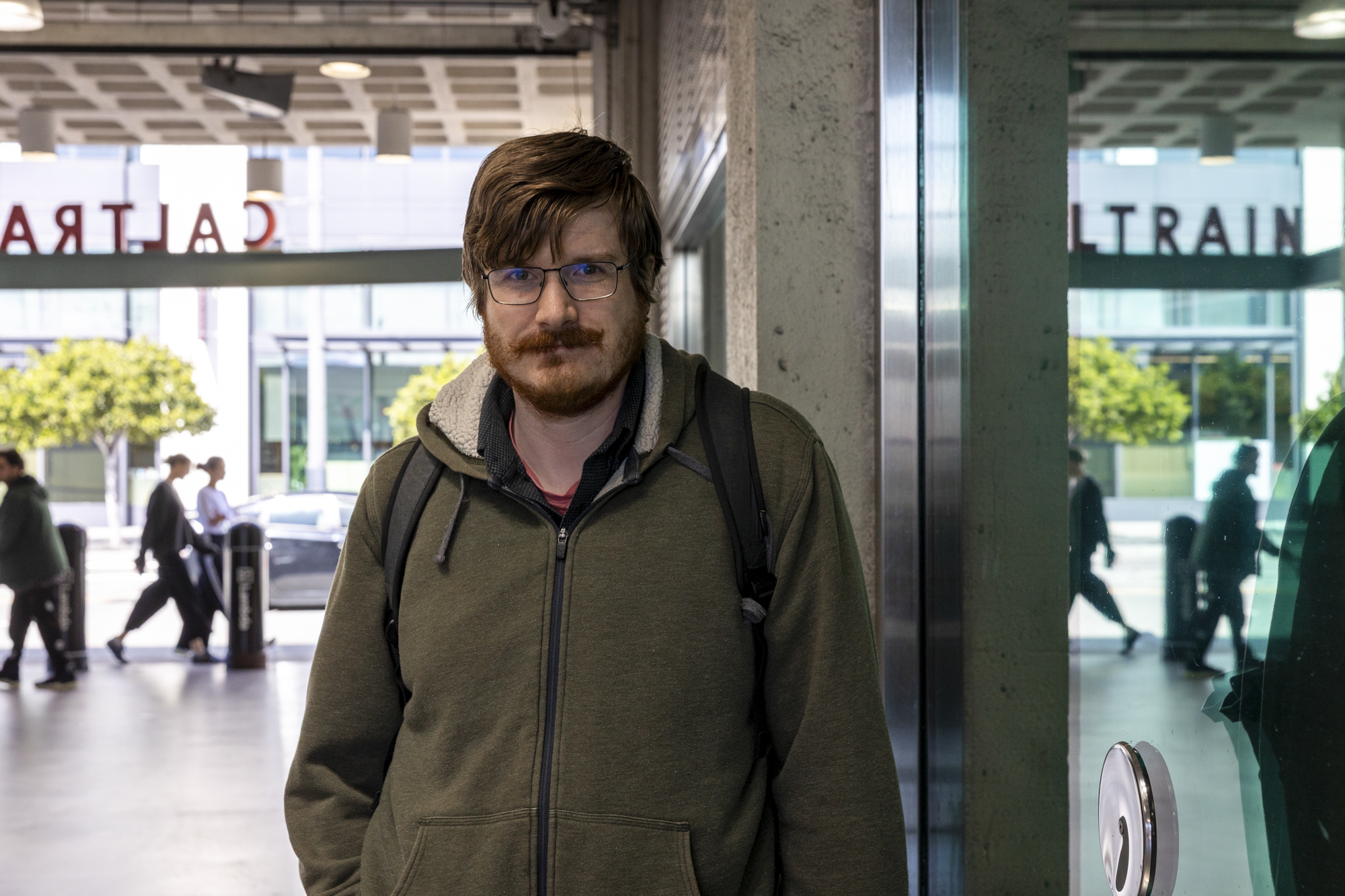 Andrew Jardner poses for a portrait at the Caltrain station on King Street and Fourth Street in San Francisco on April 27, 2026. (Tâm Vũ/KQED)