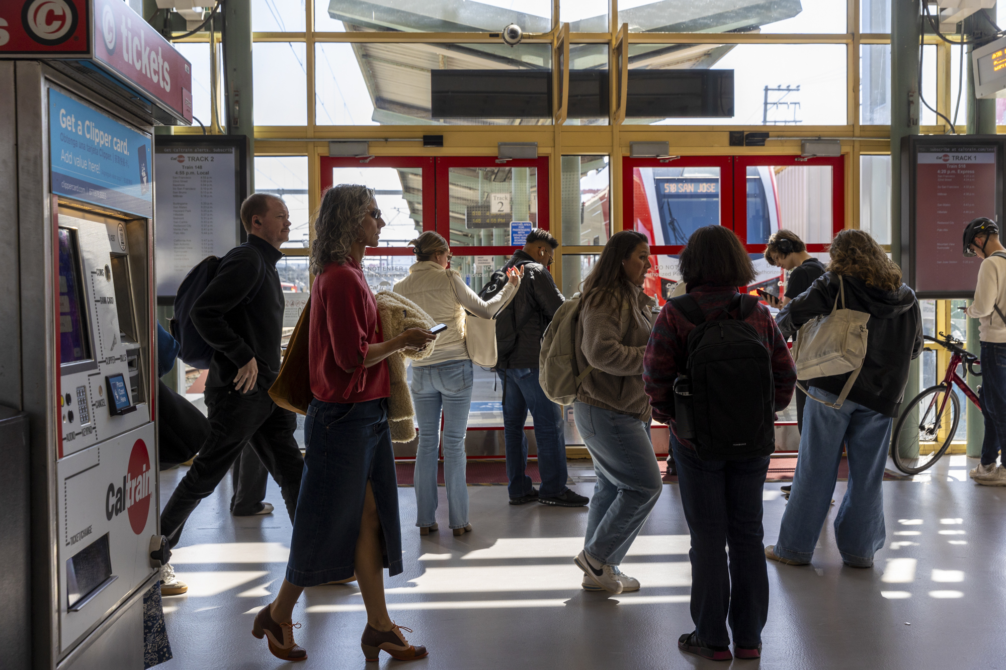 Transit riders walk through the Caltrain station on King Street and 4th Street in San Francisco on April 27, 2026. BART, Muni and Caltrain report major increases in ridership this spring. The agencies say that’s due to nice weather, better service and the Ohtani Effect, among other reasons. (Tâm Vũ/KQED)