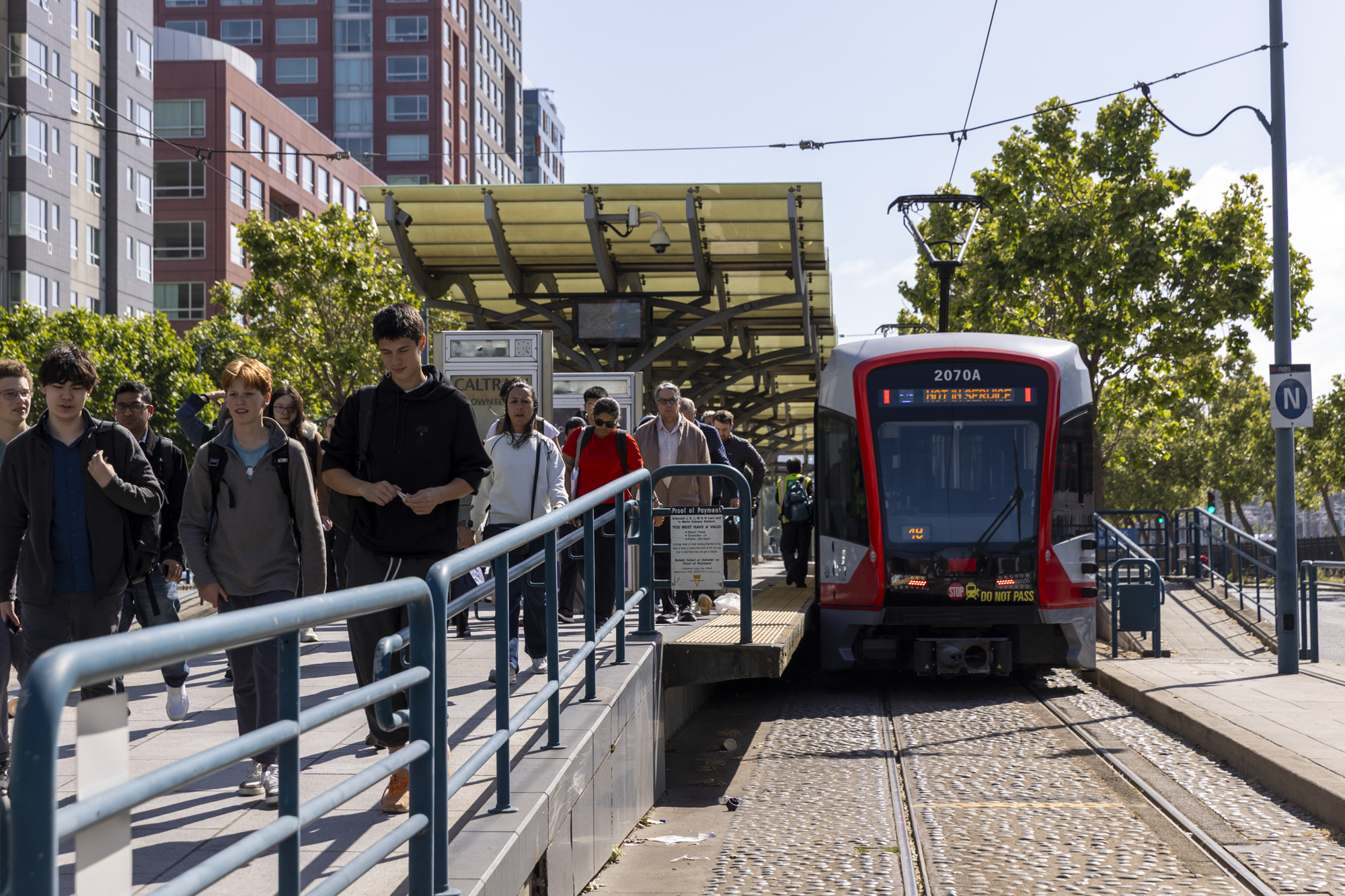 Transit riders exit a Muni train on King Street and Fourth Street in San Francisco on April 27, 2026. (Tâm Vũ/KQED)