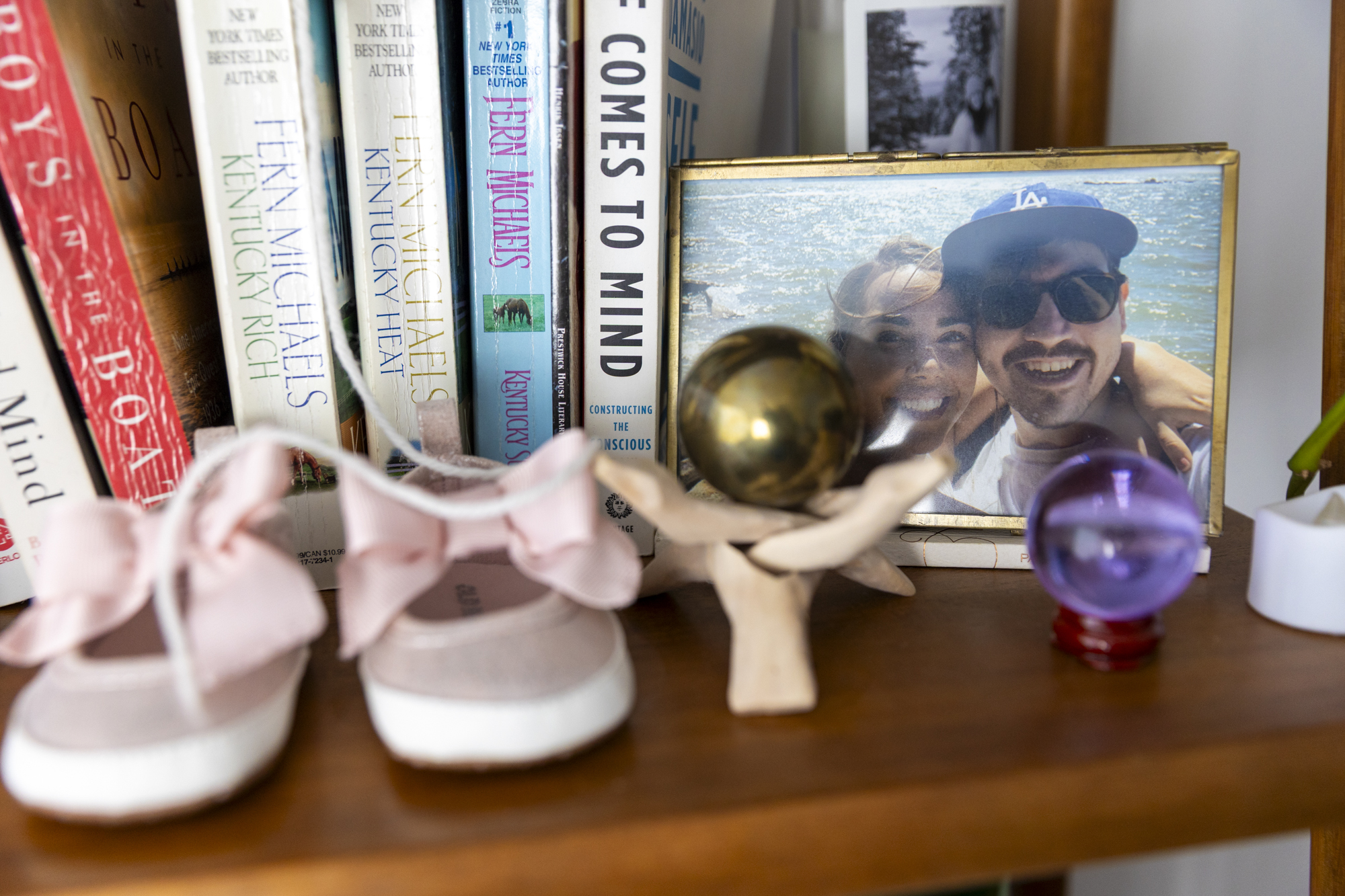 A photo of Lauren Fierro (left) and Jimmy Phillips (right) on a shelf with baby shoes in their home in Oakland on March 25, 2026. (Tâm Vũ/KQED)
