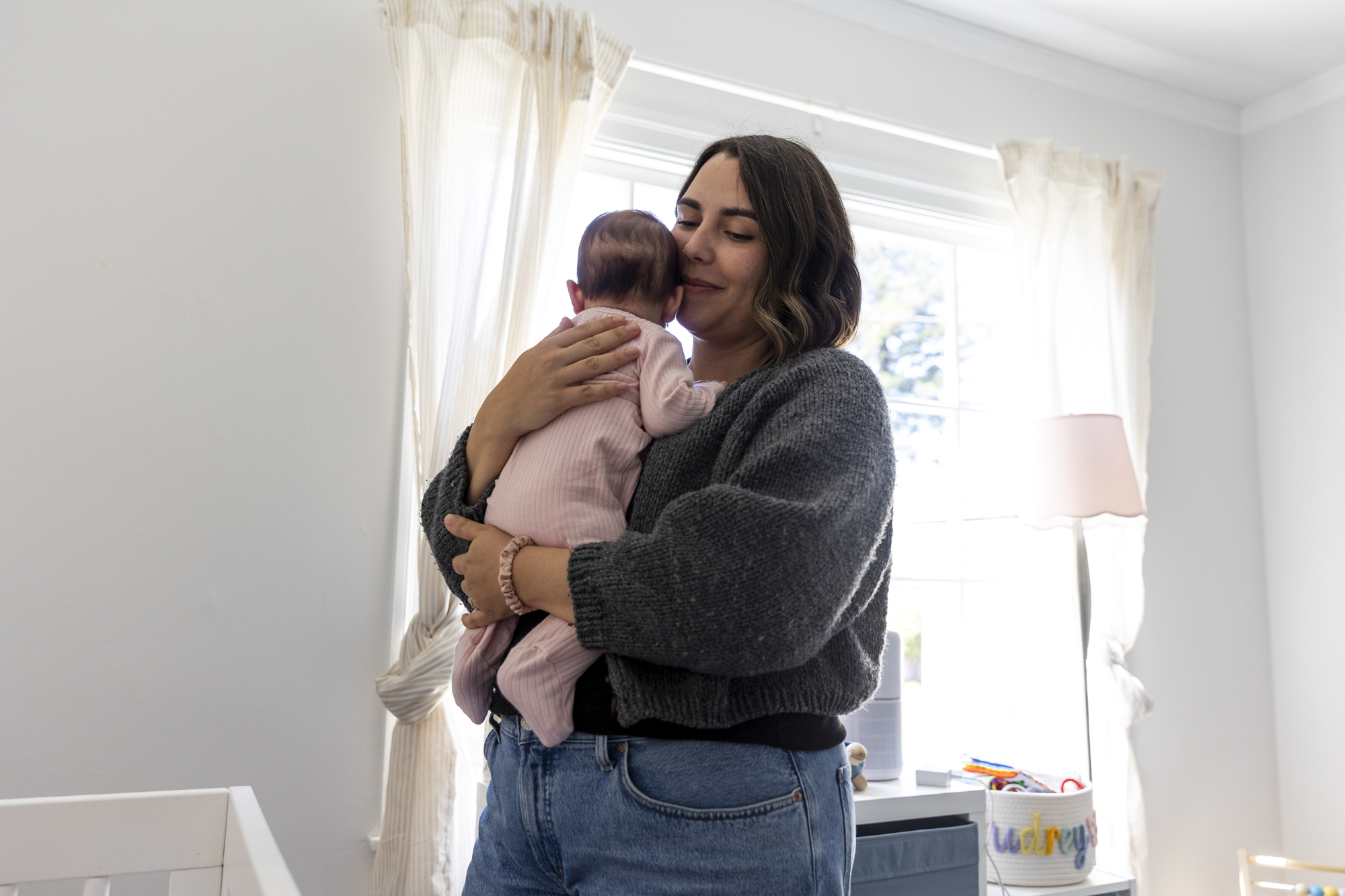Lauren Fierro soothes her daughter Audrey Fierro-Phillips for nap time in Oakland on March 25, 2026. Fewer Bay Area residents are choosing to have kids. For the ones who do, many have to choose between location, price and size to make it affordable.