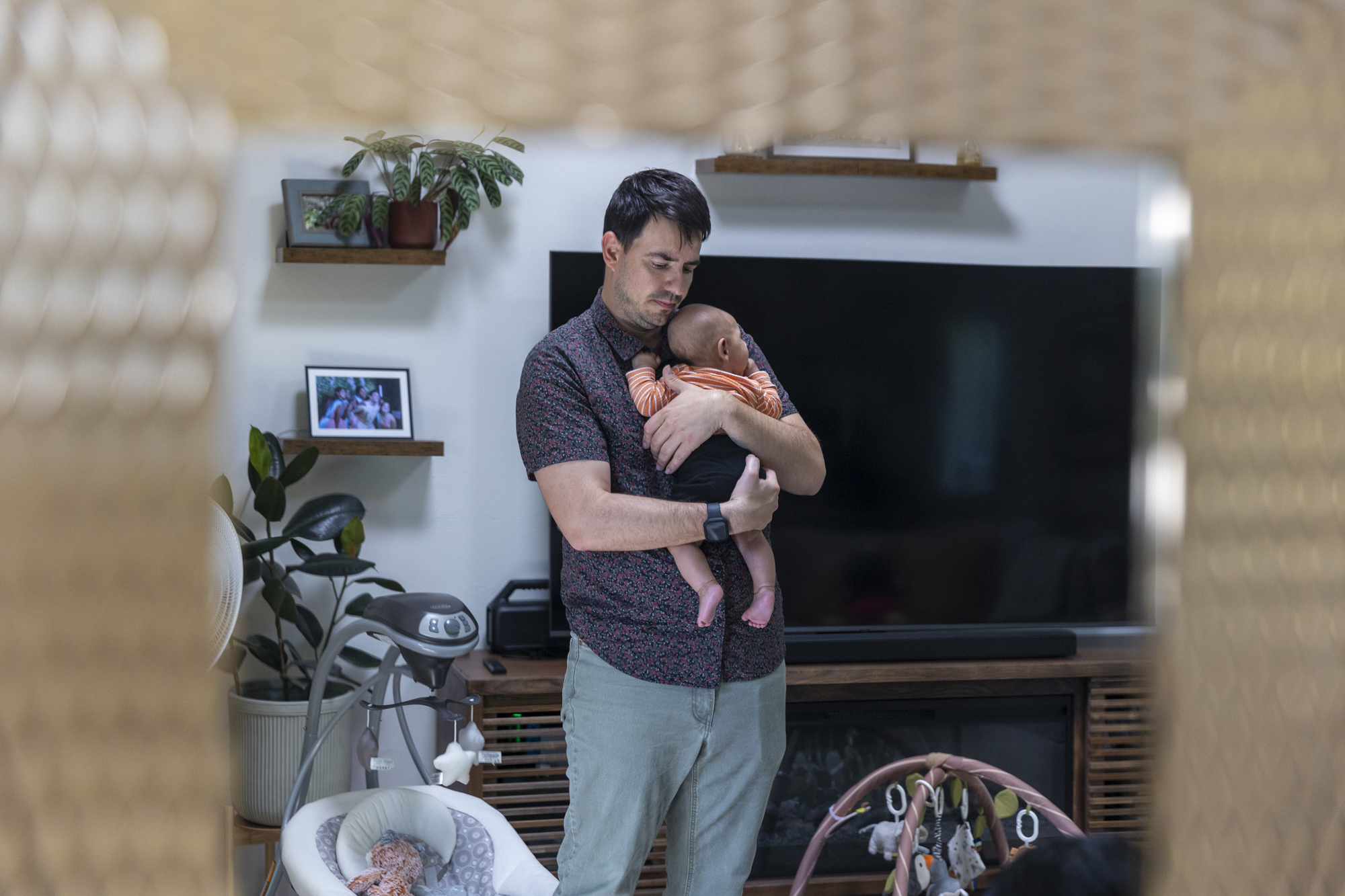 Andy Simmons (left) holds his son Kiran Cole’s (right) foot in their home in Oakland on March 25, 2026. (Tâm Vũ/KQED)
