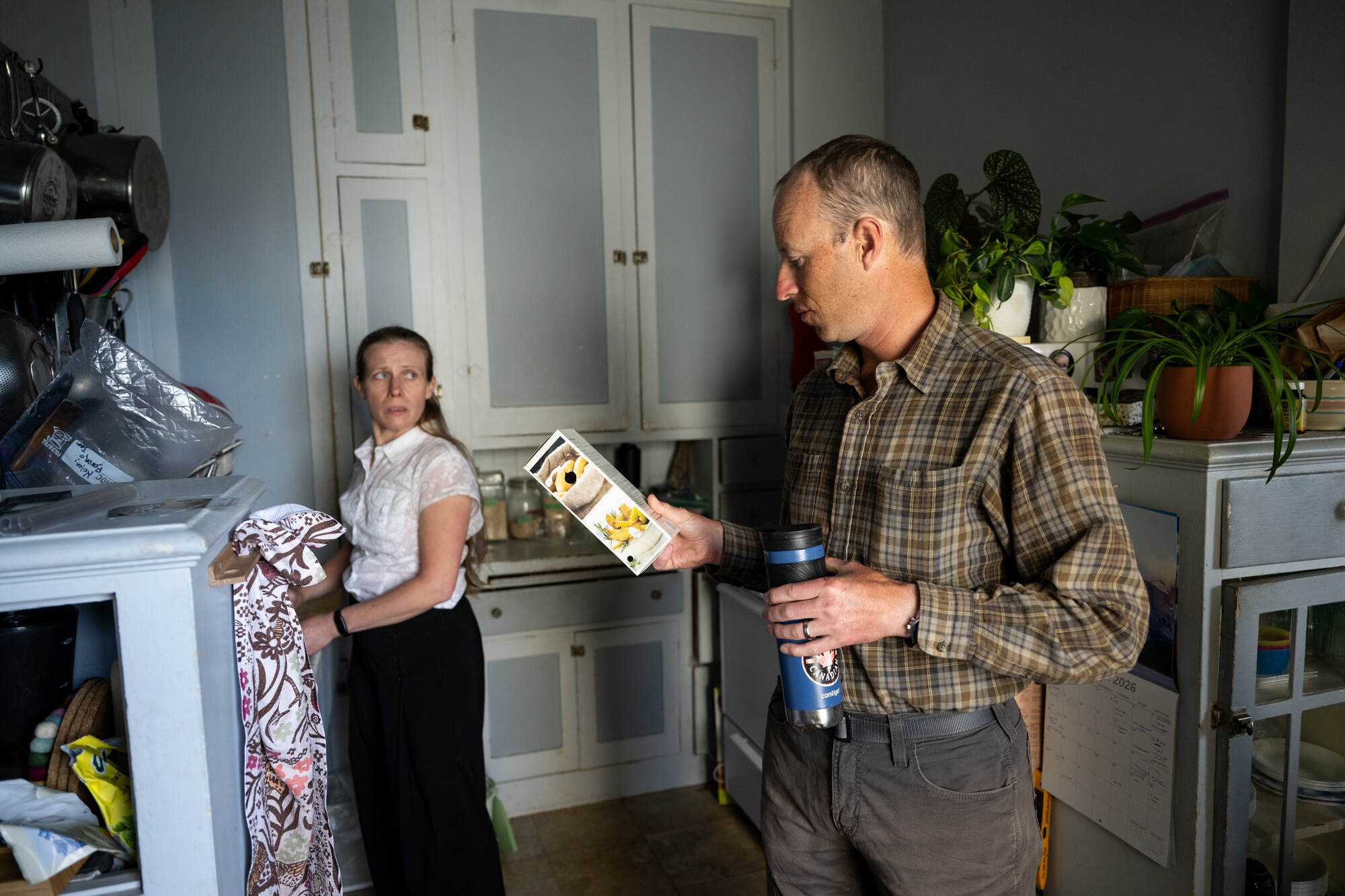 Heidi Truman (left) and husband Logan talk in their kitchen in the studio apartment they share with their sons in San Francisco on March 26, 2026. (Beth LaBerge/KQED)