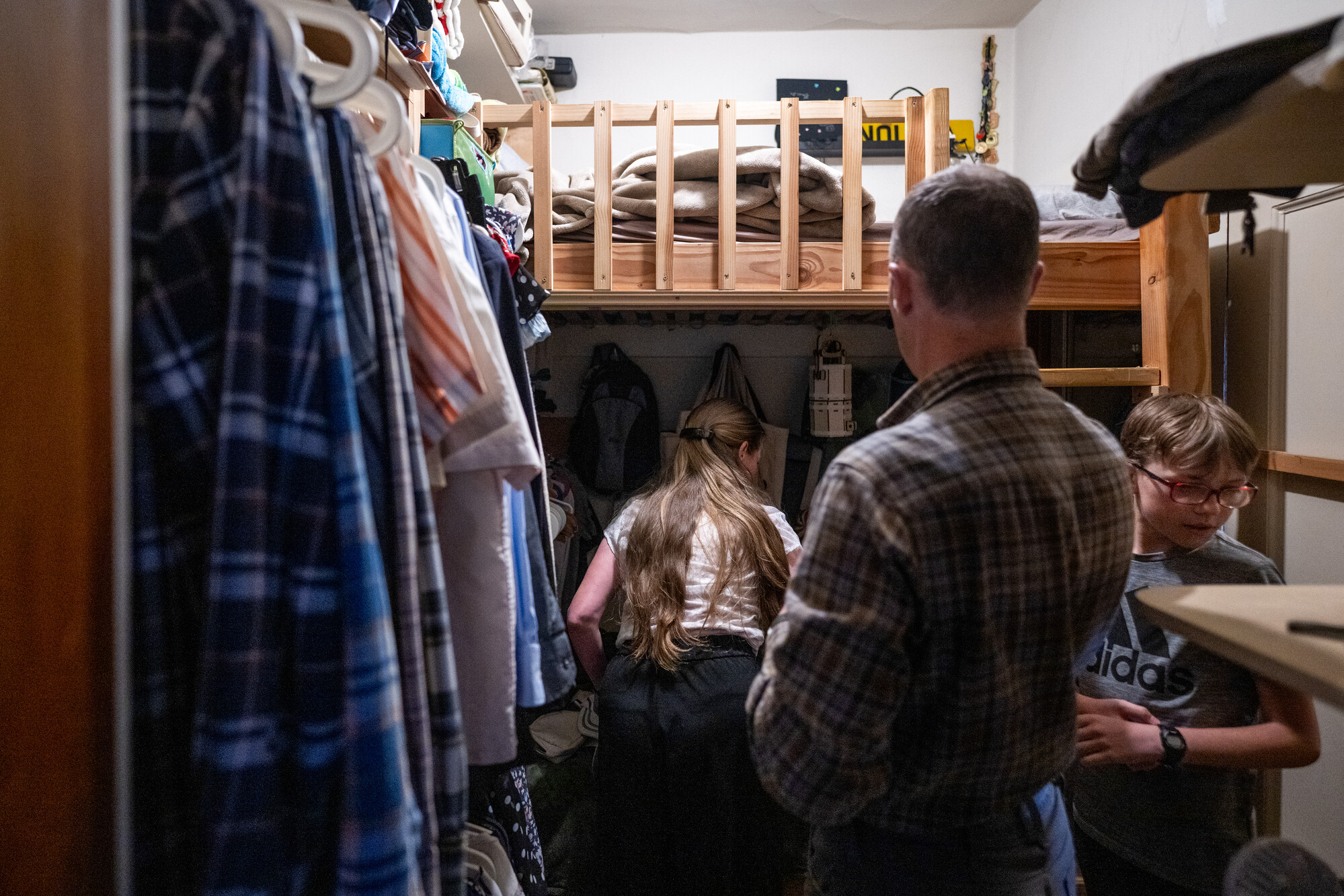 Logan and Heidi Truman and their son, Baron, 11, stand in the walk-in closet converted to a bedroom at their studio apartment in San Francisco on March 26, 2026. (Beth LaBerge/KQED)
