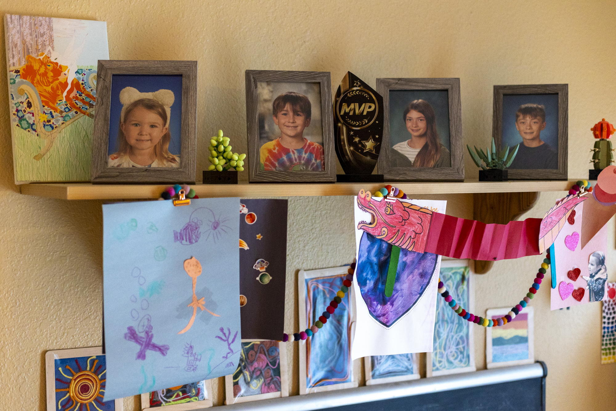 The Knuttel-Quisenberry home is decorated their children’s photos and art in American Canyon on March 25, 2026. (Tâm Vũ/KQED)