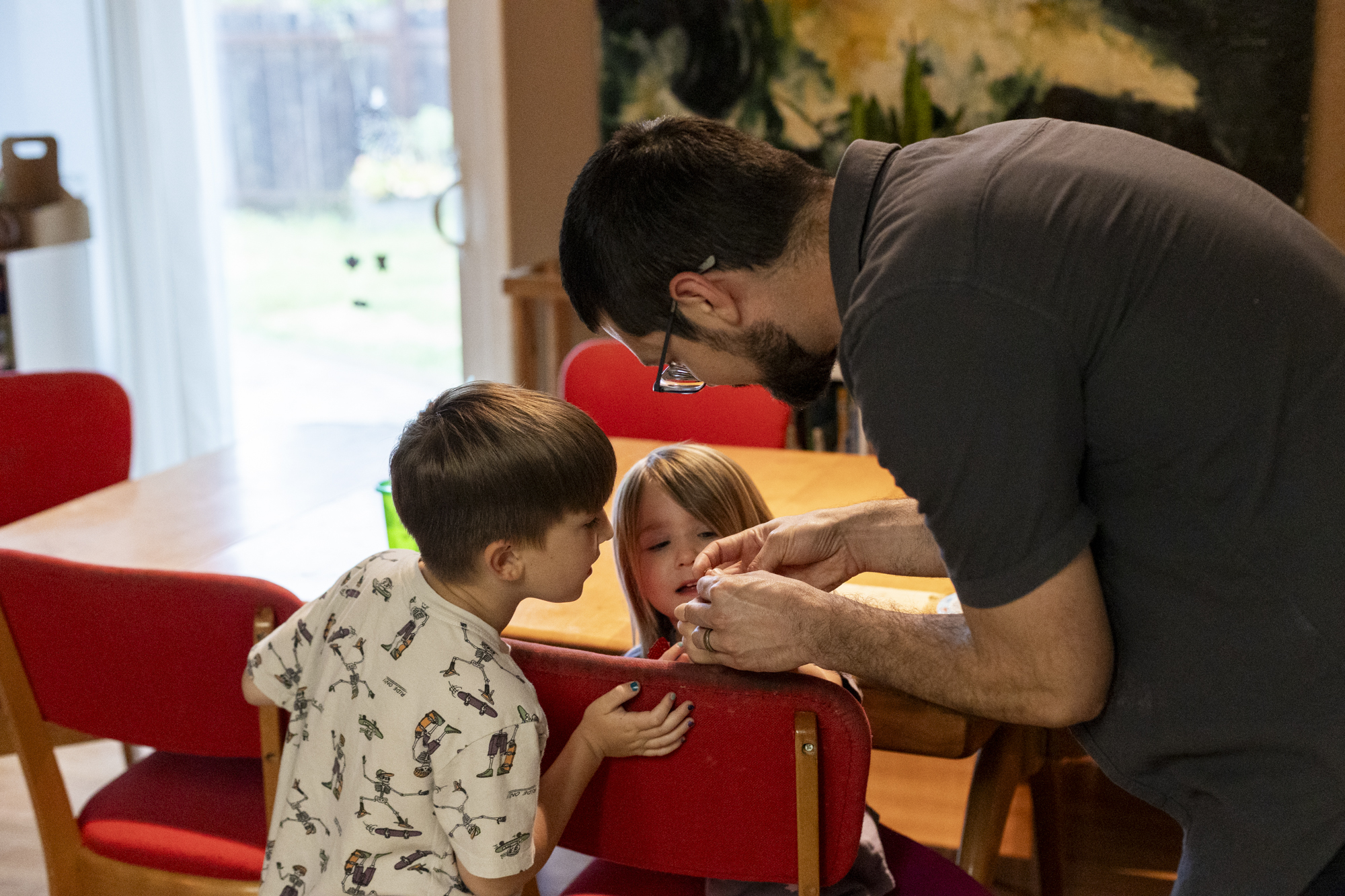Kate Knuttel (left) talks to her daughter Chloe (right), 6, about dinner time in their home in American Canyon on March 25, 2026. (Tâm Vũ/KQED)