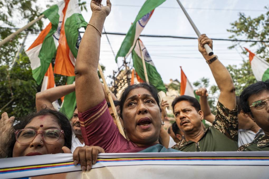 "caption": "Supporters and members of the National Congress Party wave Indian flags to celebrate the Indian armed forces' missile strikes on targets in Pakistan and Pakistan-administered Kashmir under 'Operation Sindoor,' in retaliation to the Pahalgam terror attack, in Guwahati, India, on May 9, 2025. As conflict arises between India and Pakistan, its diaspora communities in the Bay Area are watching the events unfold — and many are calling for de-escalation.",