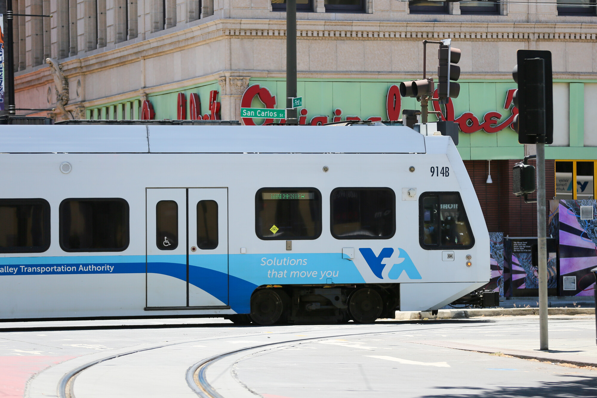 "caption": "A VTA light rail train rolls down the tracks on San Carlos Street in San José on June 26, 2025. The VTA is holding Free Fare Day Tuesday in an effort to thank existing riders and attract new ones. ",