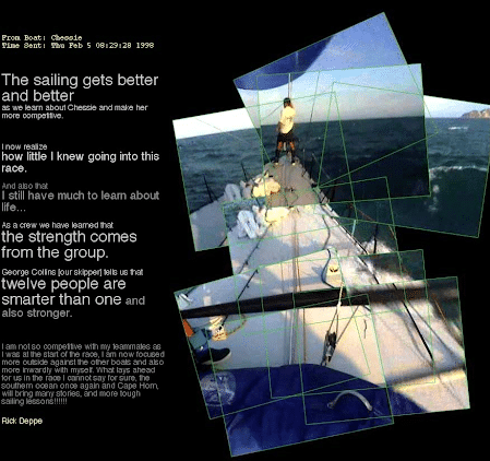 The linking of story and data was something Rodenback was learning in the days before broadband, before mobile, before most kids pitching at Y Combinator were able to ride a bike. When at Quokka Sports, he was trying to "embed the internet" into coverage of the ’97-'98 Whitbread Round the World yacht race. It was new. It pushed the state of technology, and it was cool: you could track racing sailboats automatically by GPS data, with video and images pushed from mast-mounted satellite dishes.
