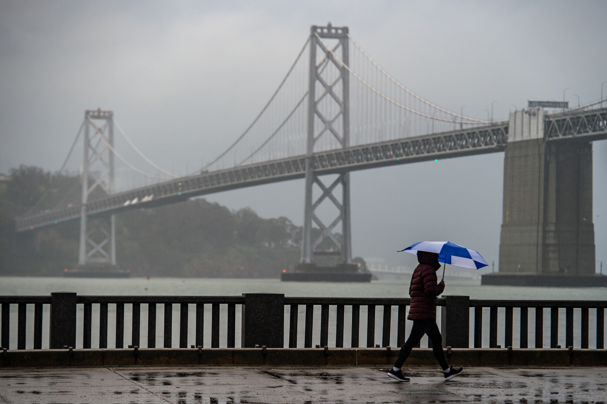 A person holds an umbrella while walking along the Embarcadero in San Francisco on Dec. 13, 2021. (Beth LaBerge/KQED)