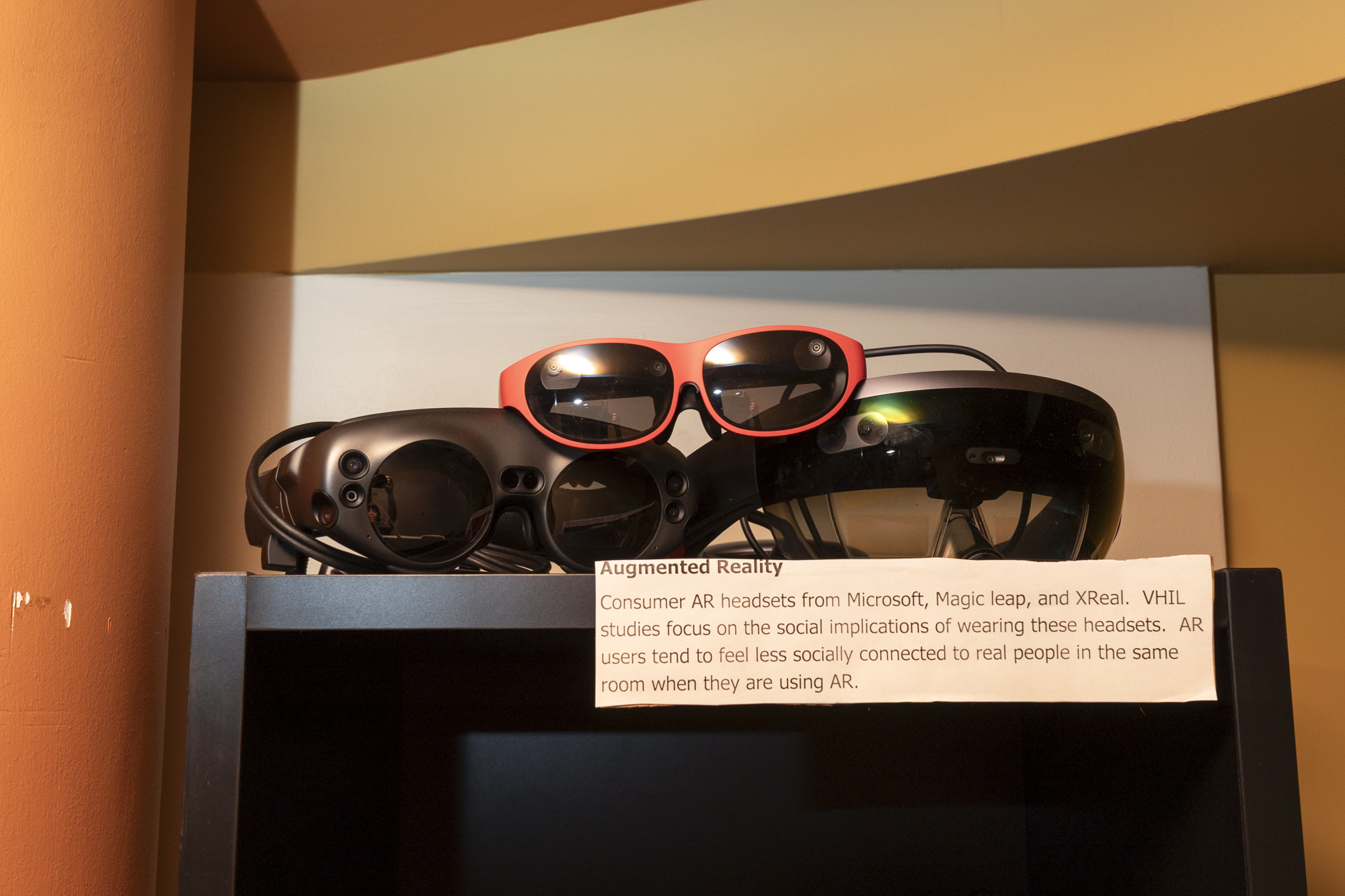 Augmented-reality headsets from Microsoft, Magic Leap, and XReal sit on display inside the Virtual Human Interaction Lab as a temporary “museum” at Stanford University. Oct. 29, 2025, in Stanford. (Gustavo Hernandez/KQED)