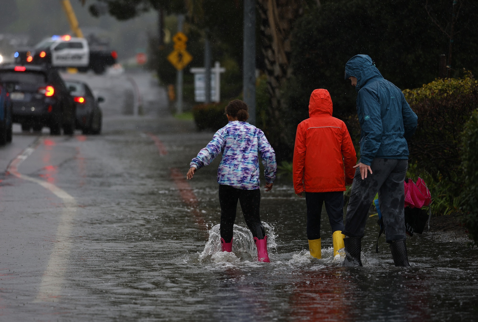 Pedestrians walk through floodwaters on Jan. 5, 2026, in Corte Madera, California. A cold winter storm will soak the Bay Area and dump multiple feet of snow on the Sierra Nevada, boosting California’s snowpack, while raising concerns over travel and potential flooding.