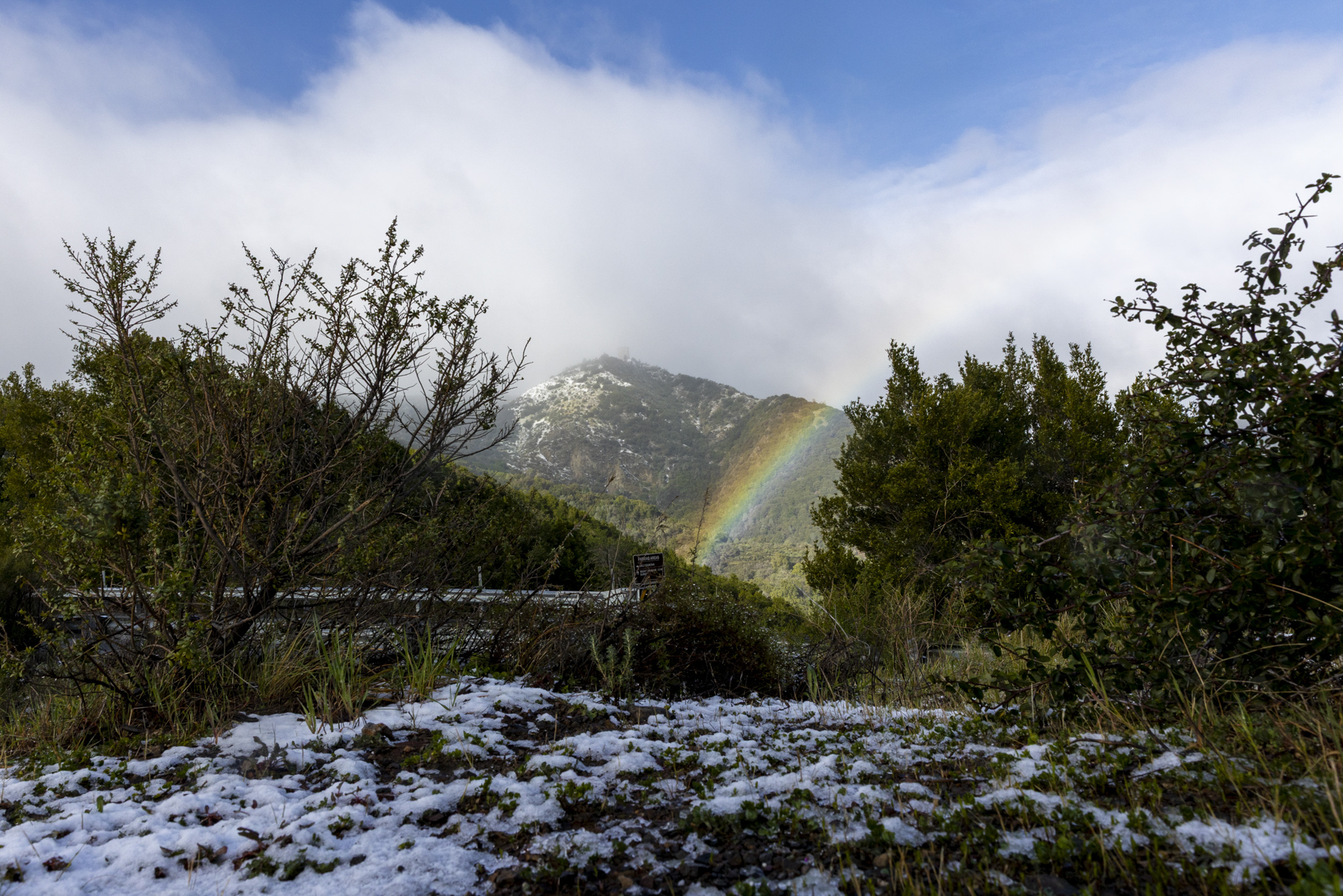 A view of a rainbow in front of the Sierra Azul mountain range, dusted with a light snow cap from a Sierra Azul Open Space Preserve Parking lot in Almaden on Feb. 18, 2026. (Tâm Vũ/KQED)