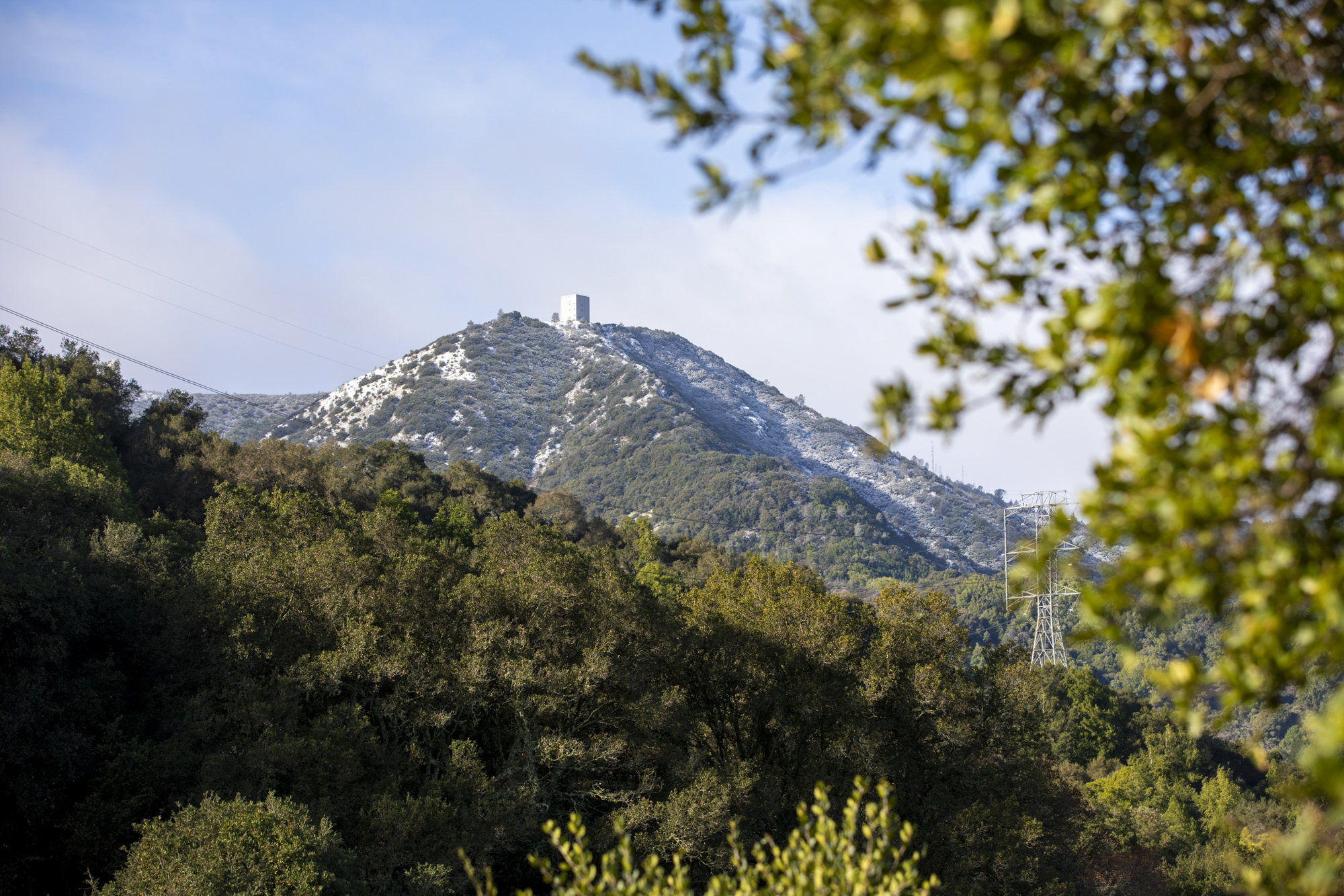A view of Bald Mountain dusted with a light snow cap from a Sierra Azul Open Space Preserve Parking lot in Almaden on Feb. 18, 2026. Snow fell on peaks around the bay, including nearby Mount Hamilton, Mount Diablo in the East Bay and Mount Tamalpais in Marin County. (Tâm Vũ/KQED)