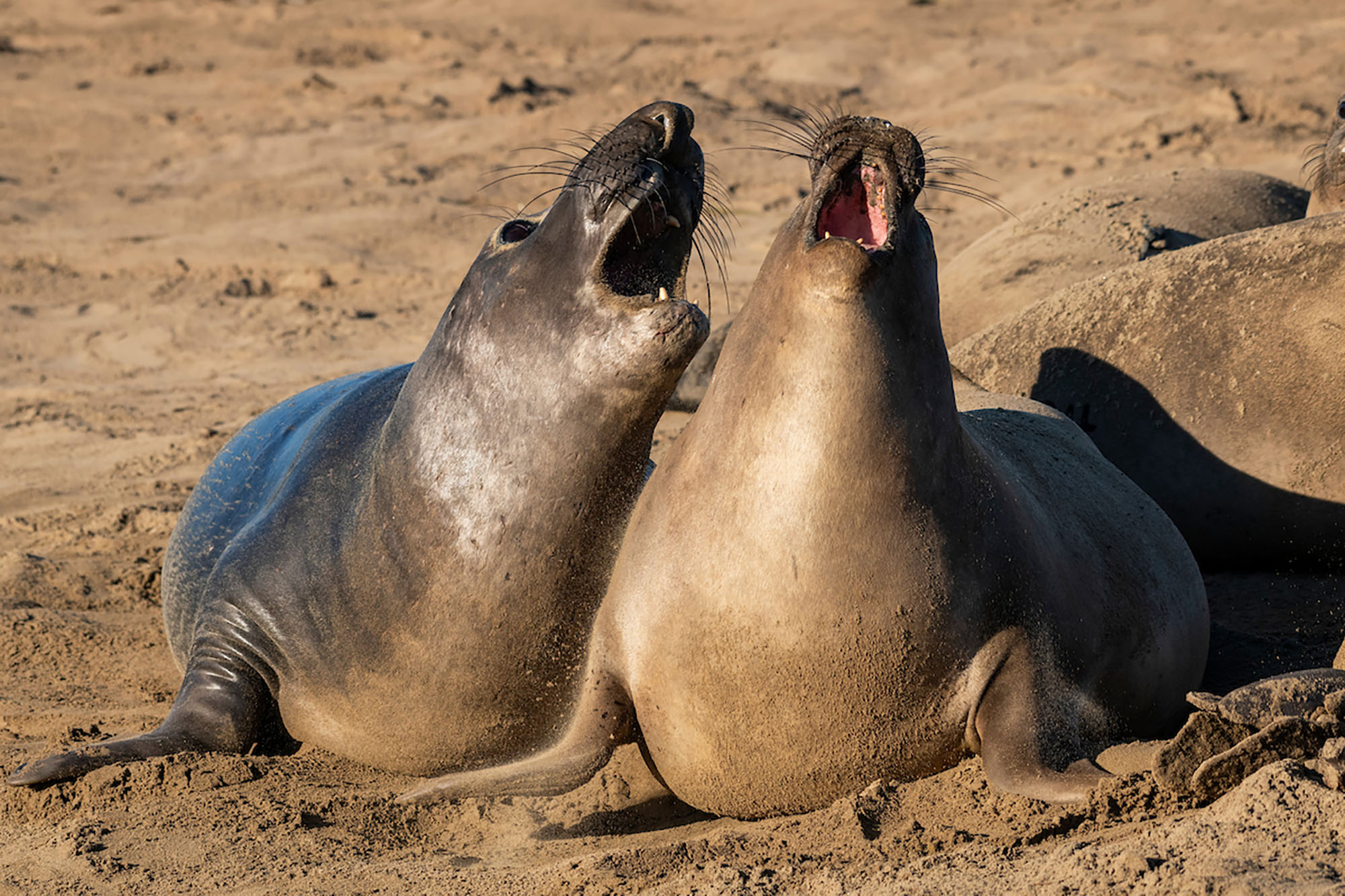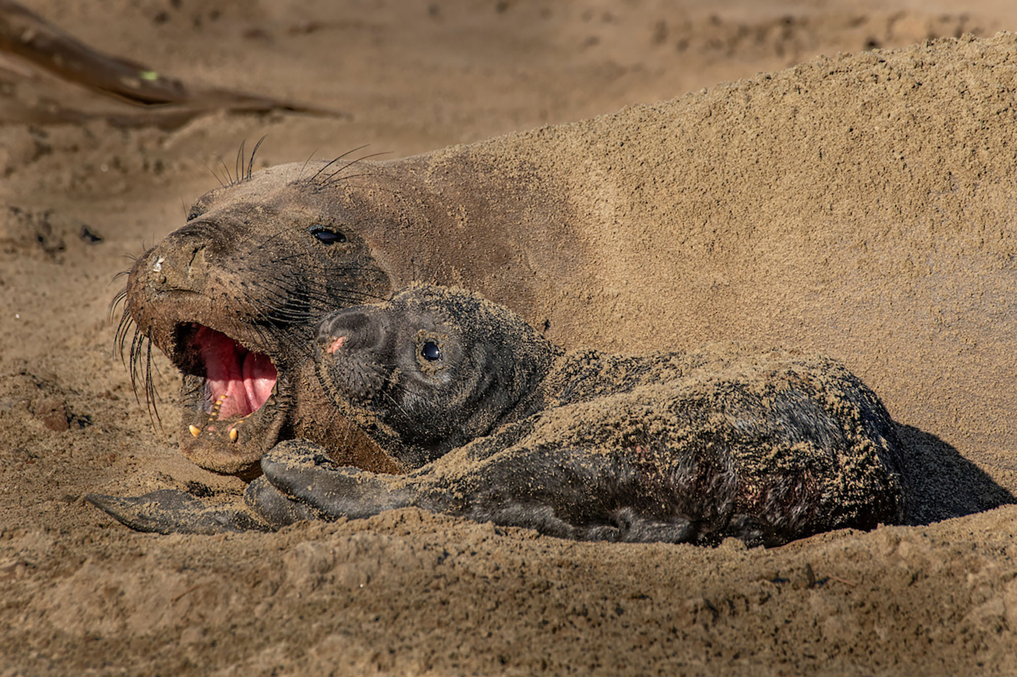 Adult males — which can weigh up to 5,000 pounds and are known for their inflatable trunk-like noses — battle for dominance, while females nurse their pups for about a month before abruptly weaning them and returning to sea.