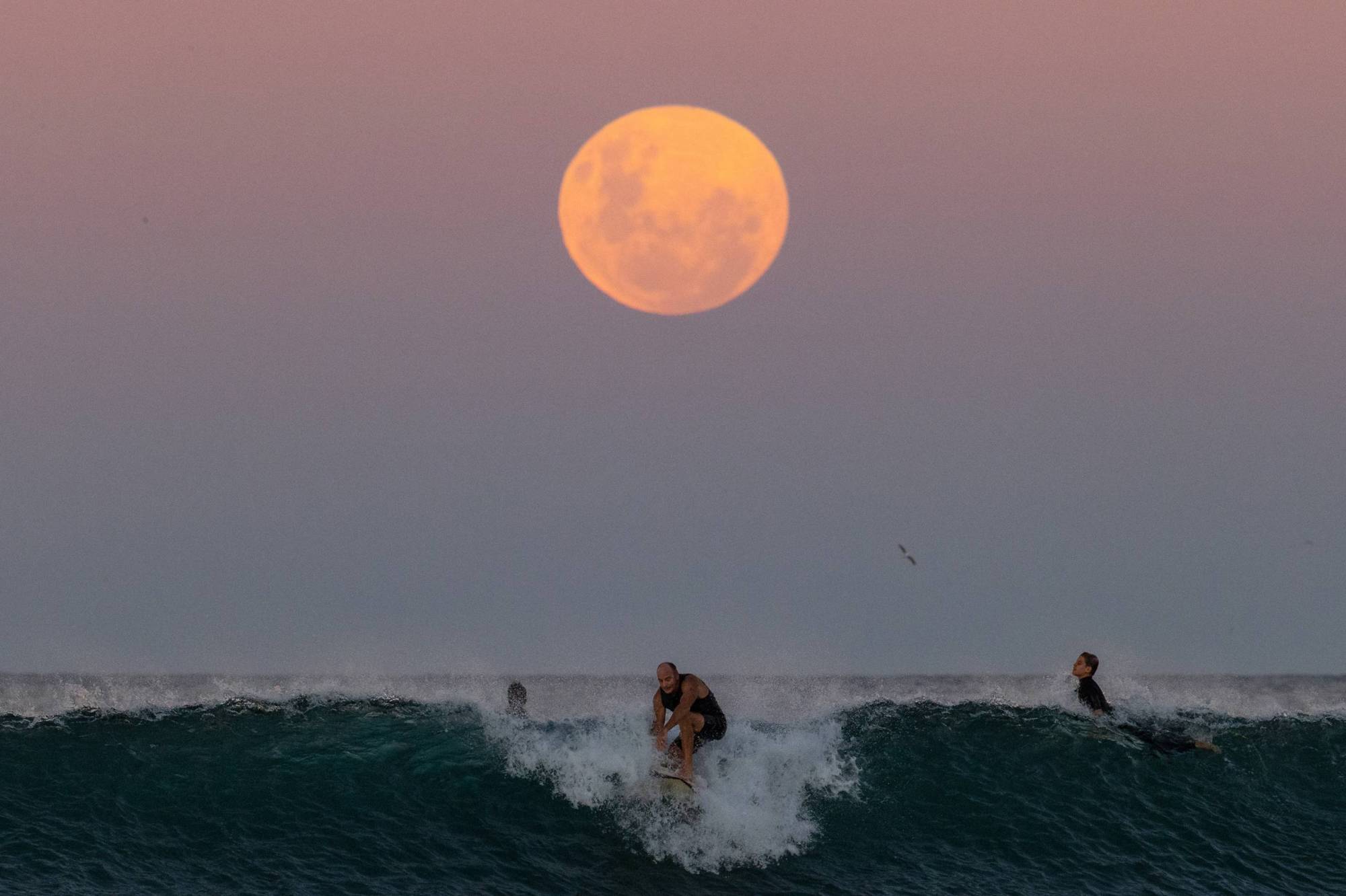 A surfer rides a wave as a super blood moon rises above the horizon at Manly Beach on May 26, 2021, in Sydney, Australia. (Cameron Spencer/Getty Images)
