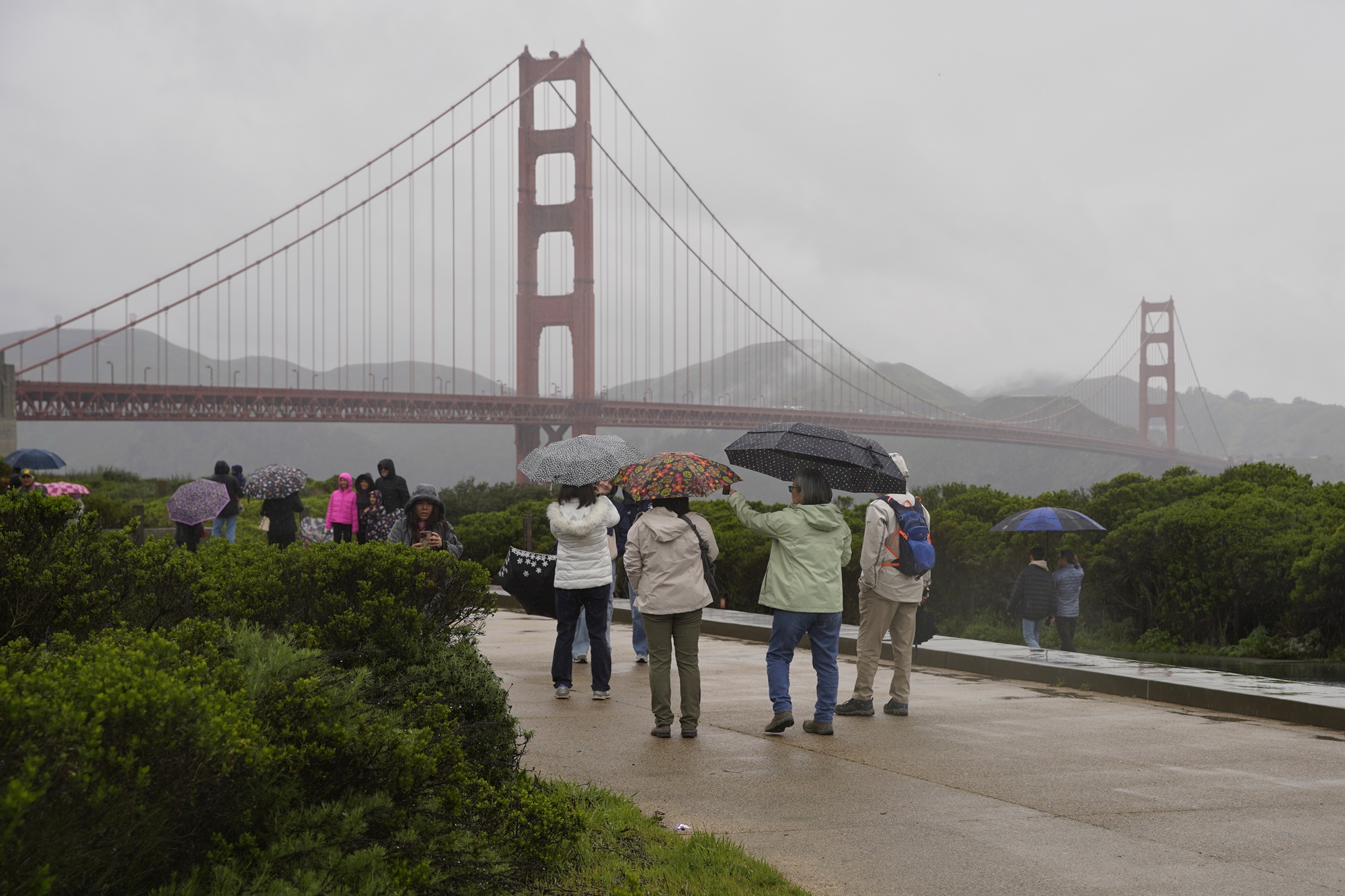 Tourist observe the Golden Gate Bridge in San Francisco on Feb. 16, 2026. Warm weather in the Bay Area gives way to cooler temperatures and rain, along with snow in the Sierra Nevada, as a cold front moves over Northern California.