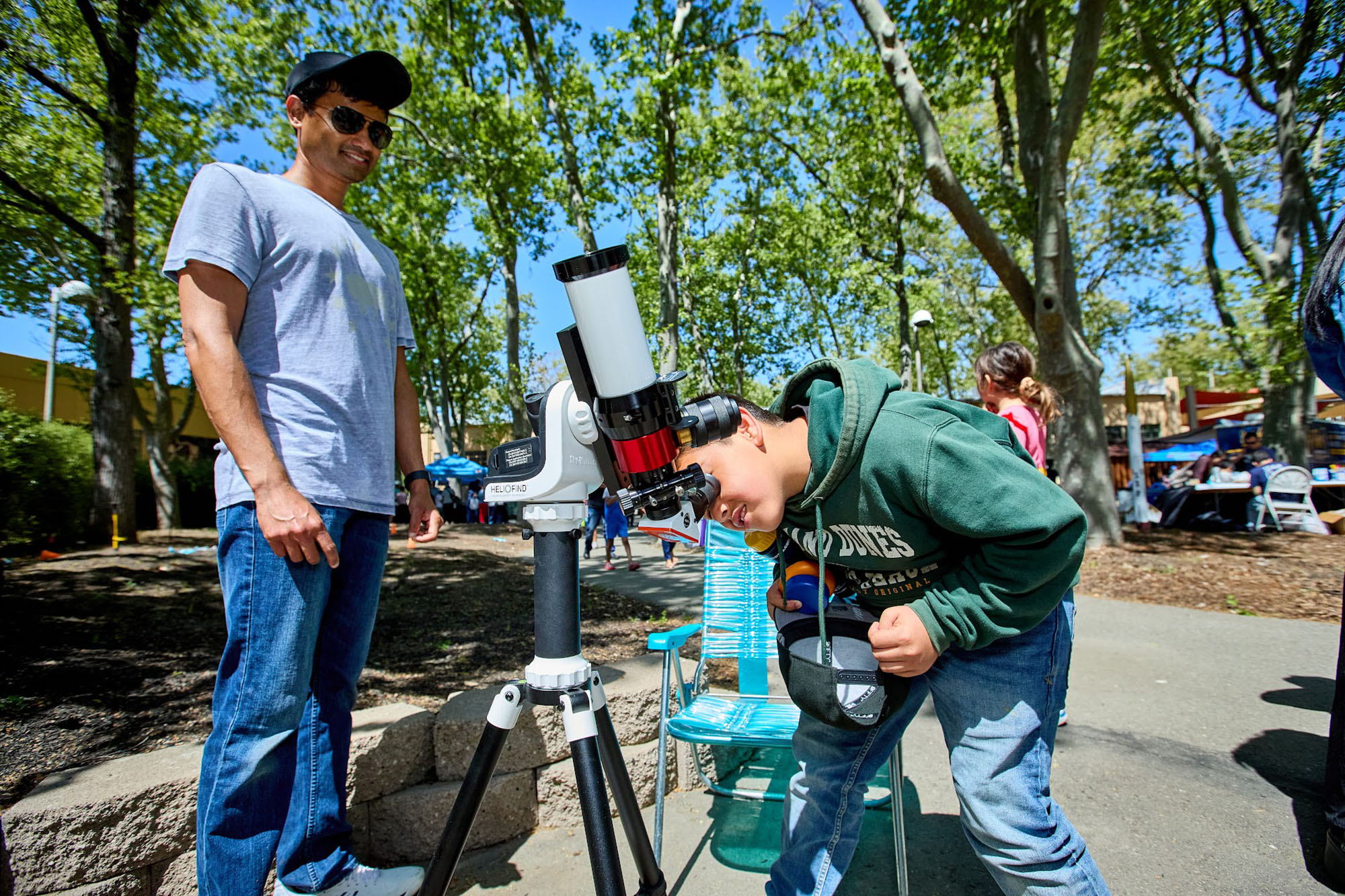 A participant looks into a telescope at the Tri-Valley Stargazers booth during the Tri-Valley Innovation Fair in April, 2025. (Courtesy of Quest Science Center)