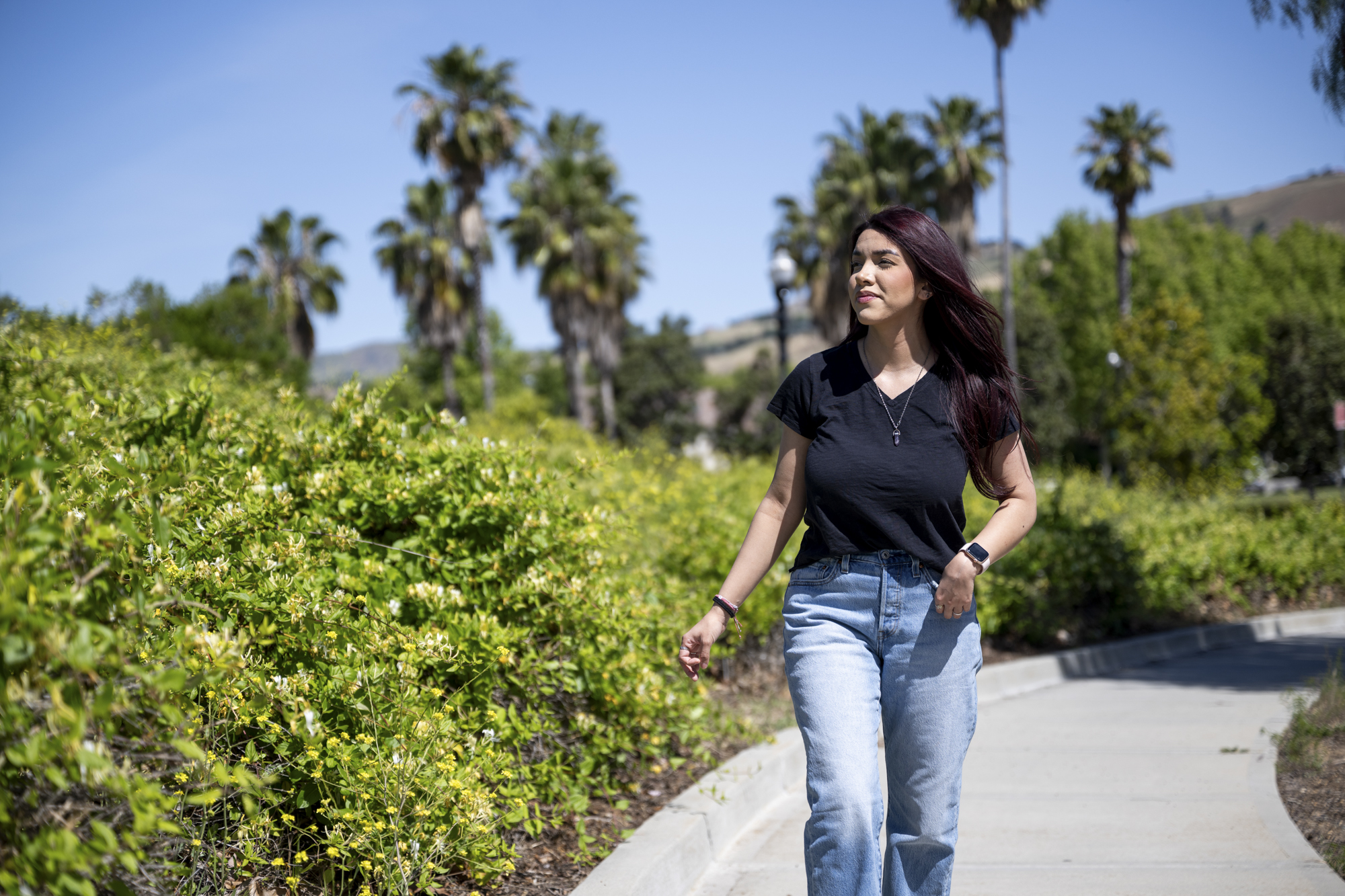 Ruby Lopez-Flores walks through Fowler Creek Park in San José on April 17, 2026. In parts of the Bay Area and Central Coast, some practitioners are increasing home visits, and even meeting clients in their cars, to ease fears of a run-in with ICE. (Beth LaBerge/KQED)