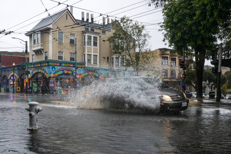 "caption": "A vehicle drives through a flooded area in the Upper Haight neighborhood in San Francisco on Nov. 22, 2024, during a storm bringing heavy rain and strong winds to the Bay Area. An early season storm could bring lightning, hail and minor flooding to the Bay Area through Tuesday, with the Sierra Nevada expecting its first major snowfall of the year.",