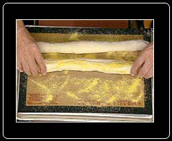 Transfer baguettes to a baking sheet lined with a nonstick mat coated with cornmeal. Roll 1 baguette in the cornmeal and arrange it and other baguettes at equally spaced intervals on the sheet. |