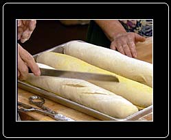With a razor or a serrated knife, score the surface of the baguettes. Slide the pad and baguettes onto the hot stone and bake for 30-40 minutes, spraying some water in the oven after 1-2 minutes to create steam. Repeat spraying again 3-4 minutes later. |