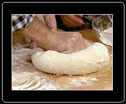 Turn the dough onto a board with additional flour and knead. After 2-3 minutes of kneading, the dough should be smooth but strong. |