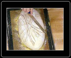 Preheat oven to 425°. Sprinkle the loaf with flour from a sieve, and, using a razor blade, make a few slashes to the top. Carefully slide the baking pad onto the hot bread stone and bake for 1 to 1-1/4 hours. |