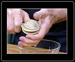 With the fingers of one hand, press on the back of the blade, sliding it between the two shells of the clam and cutting the sinew that holds the shell closed. |