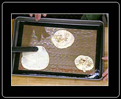 Using the back of a teaspoon, spread the dough to 5-6" in diameter, with even thickness. Batter should be very thin. Sprinkle with almonds after spreading. |