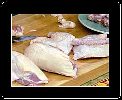 Cut each duck into 4 pieces. Reserve necks, backbones, etc., for stock. |