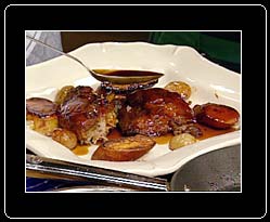 To serve: Arrange pieces of duck, skin side down, in a nonstick skillet, and cook over high heat for 1 minute. Reduce heat to med., and cook for 12-15 minutes. Place a piece of duck in the center of each of 8 plates, arrange potatoes and shallots around the duck, and coat with warm sauce. Sprinkle on chives and serve. Recipe courtesy of Alfred A. Knopf, ©2001 Jacques Pépin |
